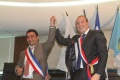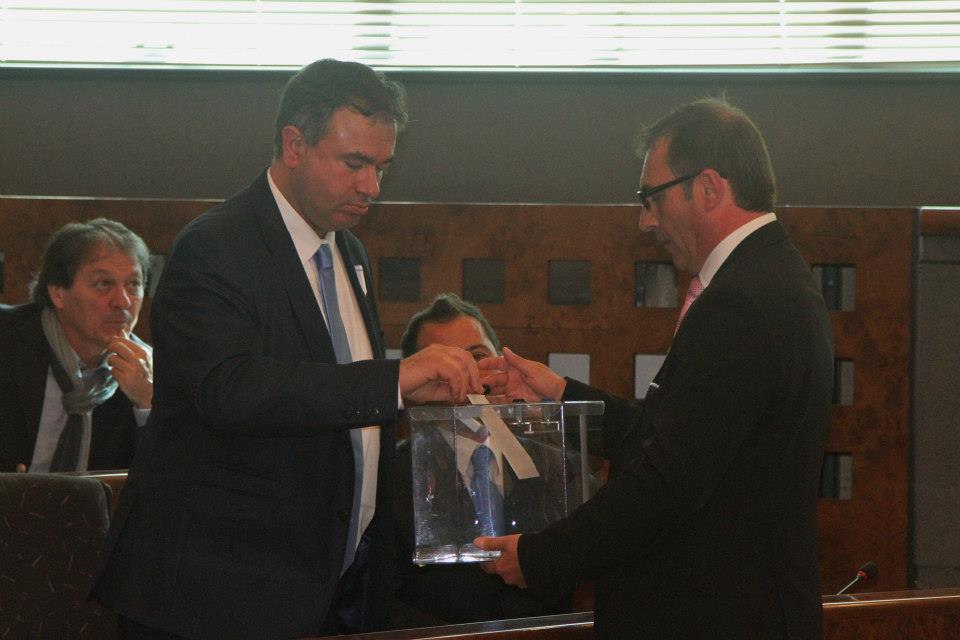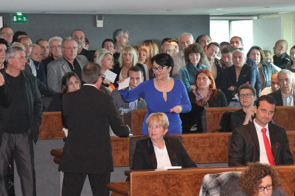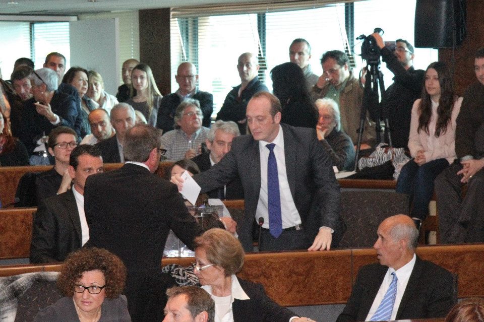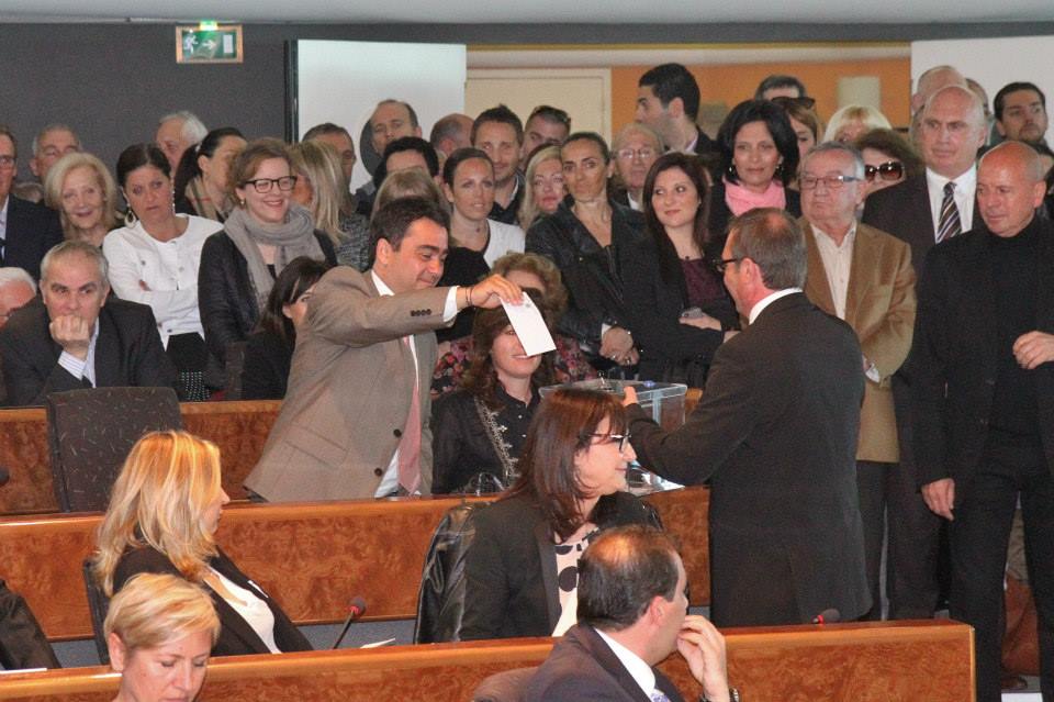 Le nouveau conseil municipal installé, le benjamin de la nouvelle équipe, Anthony Charreyre, a pris place aux côtés du doyen. Après l’appel à candidature, une seule main s’est levée, celle de Laurent Marcangeli, sous les applaudissements nourris de la salle, puis l’on a procédé aussitôt à l’élection du maire. Laurent Marcangeli a été élu par 37 voix et un bulletin blanc, l’opposition n’ayant pas participé au vote.