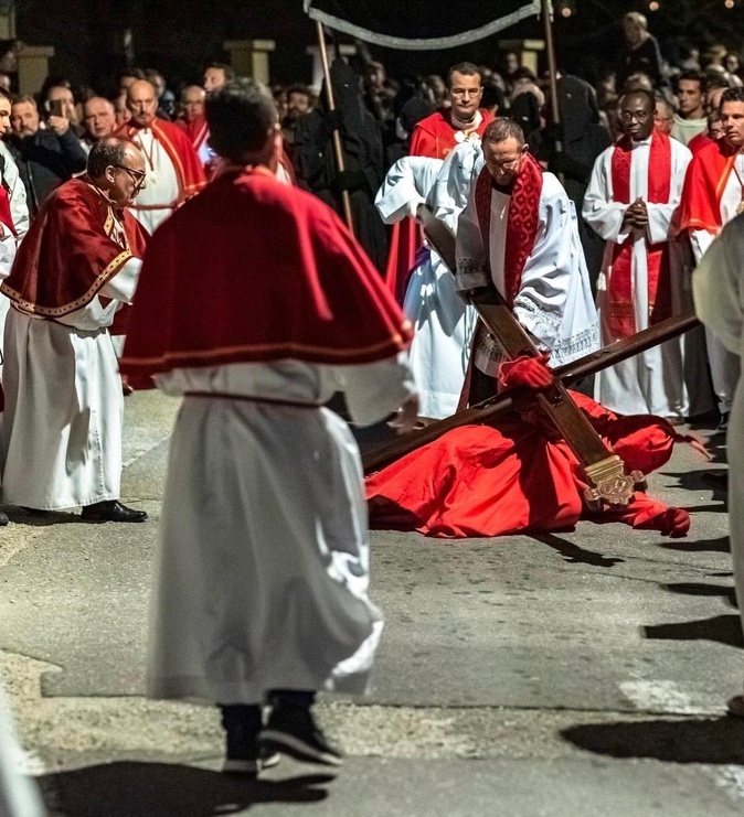 S’il connait le parcours du Catenacciu par cœur, y compris les endroits exacts où doivent se faire les trois chutes programmées pour revivre celles expérimentées par le Christ lors de sa montée vers le Golgotha, il est rattrapé par ses propres faiblesses. « Je suis tombé quand je n’en pouvais plus, quand le poids de la croix me pesait trop. Personne ne s’attendait à me voir tomber à cet endroit, quelques dizaines de mètres avant là où j’aurais dû le faire. Mais le Christ n’a pas choisi où il est tombé ». La chute est violente. Mais l’homélie du curé qui l’accompagne lorsqu’il est à terre est salvatrice. « On reste allongé quelques minutes et cela fait du bien. Cela permet réellement de se reposer et de pouvoir repartir ».