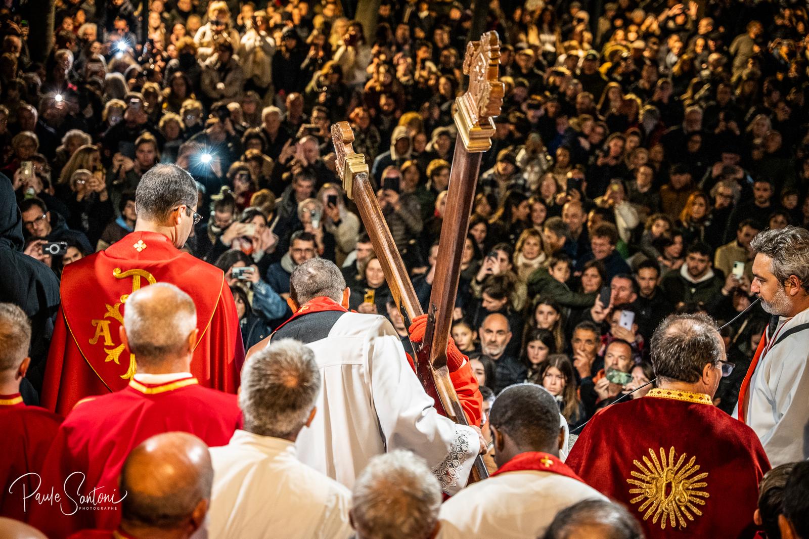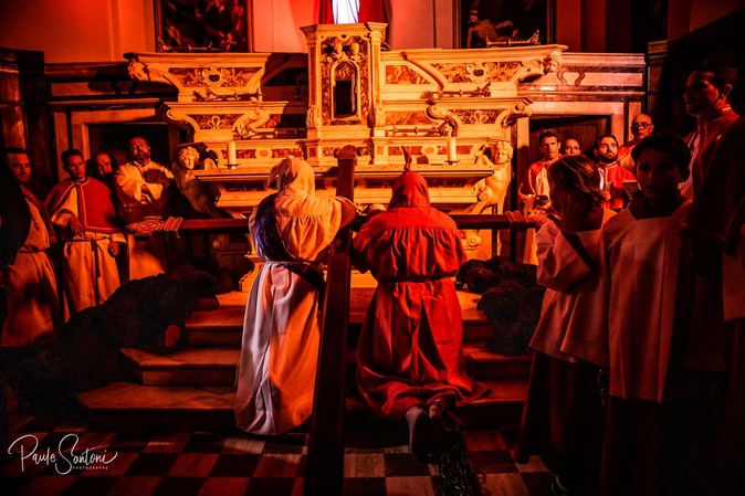 Puis vint le premier pas. Et ces chaines attachées à sa cheville pèsent aussi bien plus lourds qu’il ne l’imaginait. « Je suis déséquilibré à la première marche et je me rends compte que j’ai déjà des difficultés à traverser l’église avec la croix et les chaines. Mais je vis cela comme un rêve, je me demande si je suis réellement là, si je ne suis pas dans un coma quelque part en train de tout imaginer. J’ai du mal à faire la part des choses sur la véracité de ce que je suis en train de vivre ». Une sensation troublante qui lui permet malgré tout d’avancer et d’arriver aux portes de l’église qui s’ouvrent devant lui. « C’est le moment le plus intense. Sur la place, les chants commencent. J’entends monter le Perdono mio Dio que je connais par cœur. C'est très émouvant. Mais je suis dans un autre monde, dans une espèce de bulle. Je ne vois rien, j’entends juste les chants et je me laisse guider ».