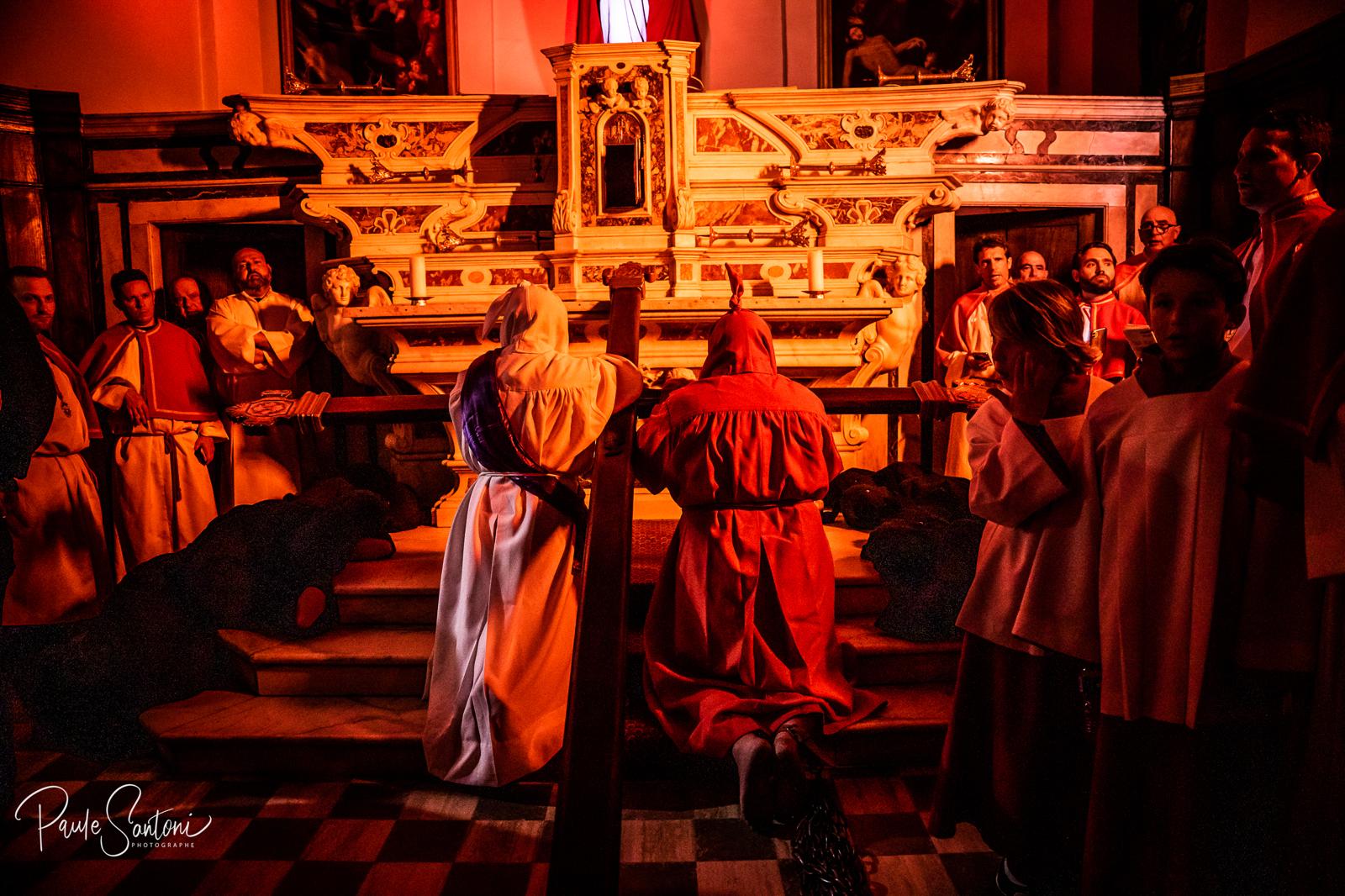 À la fin de la confession du pénitent, il est 18 heurs. L’heure de la procession approche. Le curé de Sartène vient alors lui déposer une valise dans laquelle l’homme trouve la tunique rouge, la cagoule et le cordon. « On l’appelle l’habit de lumière », explique-t-il, « C’est une tenue qui se passe de pénitent en pénitent. Et l’enfiler a une symbolique encore plus forte pour moi, car mon arrière-grand-père avait lui aussi été un pénitent ». Une heure plus tard, on vient le chercher pour le conduire à l’église Sainte-Marie. « Je commence à avoir une énorme pression car on traverse la ville et je vois il y a énormément de monde partout », livre-t-il. Mais plus que cette foule massée autour de la place Porta dans l’unique objectif d’assister à la procession dont il sera l’élément central, l’homme commence également à paniquer car respirer dans cette cagoule seulement percée d’étroites fentes à la place des yeux s’avère très compliqué.