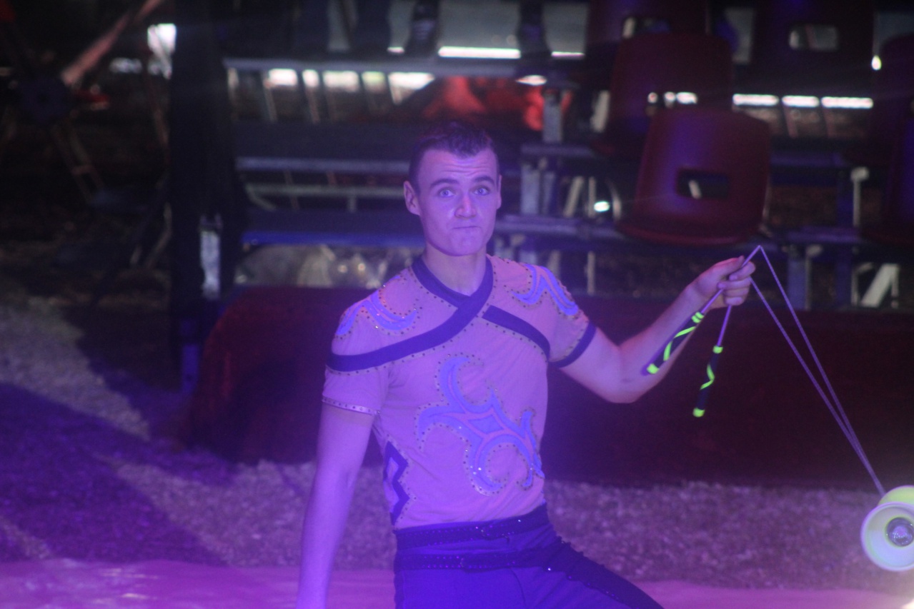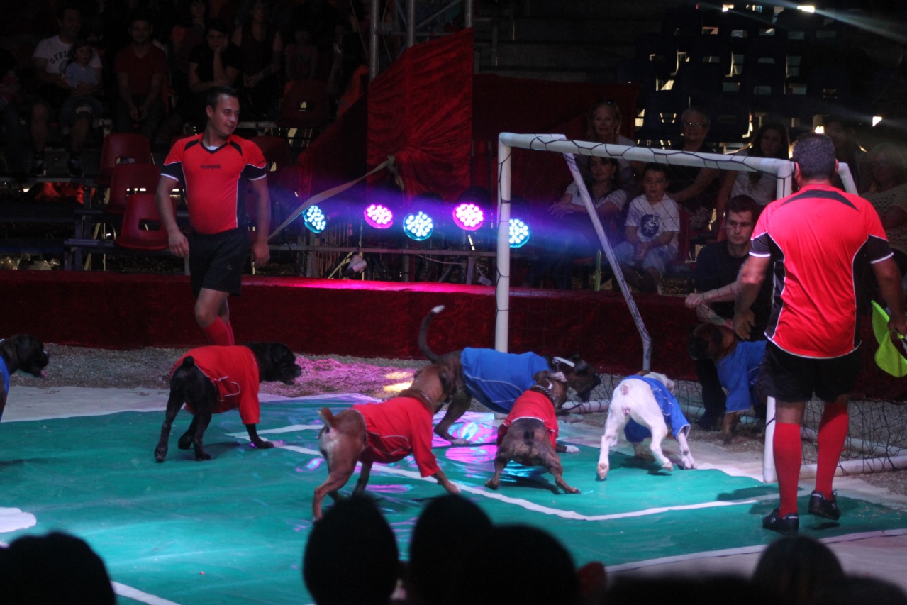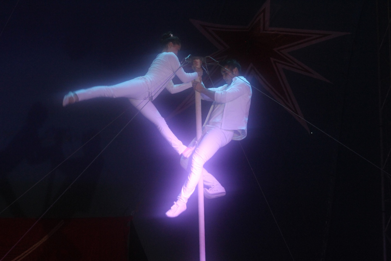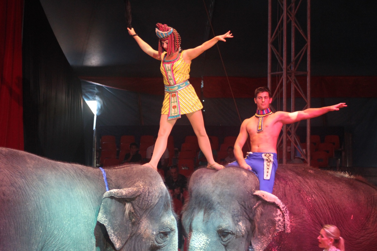 La salle est quasi complète en ce début d’après midi, Monsieur Loyal alias Michel Palmer fait son entrée pour présenter le premier numéro. Deux artistes qui nous viennent du Kazakhstan, Hamlet et Kamilia dans un numéro sur le mat chinois et déjà, le spectateur a le souffle coupé. Dans le même style on retrouvera Les Olympos qui viennent du Brésil et dont la particularité est de présenter un numéro de « main à main » à trois, Julia et Vlad d’Ukraine et leur rubans aériens ou encore Alisher le Russe dans un numéro de sangles époustouflant. Entre deux, des présentations d’adresse ou de magie avec Victor, le breton national et ses diabolos ou bien Joseph et Desy les espagnols dans un magic show impressionnant ou encore Emin le contorsionniste époustouflant. On n’oublie pas les animaux comme Mina et Camelia, les deux éléphantes venues d’Inde, présentées par Sarah Houcke, spécialiste du dressage d’animaux sauvages ou comme cette équipe de chiens boxers footballeurs entrainée par le Bulgar Mickaël ni le duo britanique formé par Patrick et Rogers son otarie. Et si tous ces numéros ont plu aux enfants, ces derniers ont également bien ri avec Popeye le clown et toute sa famille mais sont sans aucun doute restés sans voix devant le robot Transformer venu tout droit des Etats-Unis.