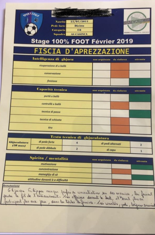 En effet, l'initiative est particulièrement louable et enfants comme parents semblaient pleinement satisfaits de cette véritable valeur ajoutée. " En plus des fiches d'évaluations qui étaient rédigées en langue corse, on affichait chaque jour le programme de la journée sur un tableau et ce dernier était également exclusivement rédigé en corse. Et enfin, chaque enfant s'est vu remettre un lexique franco-corse en rapport avec le football. "