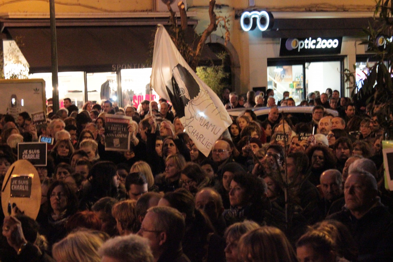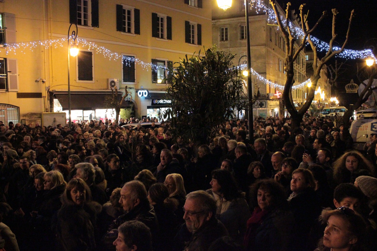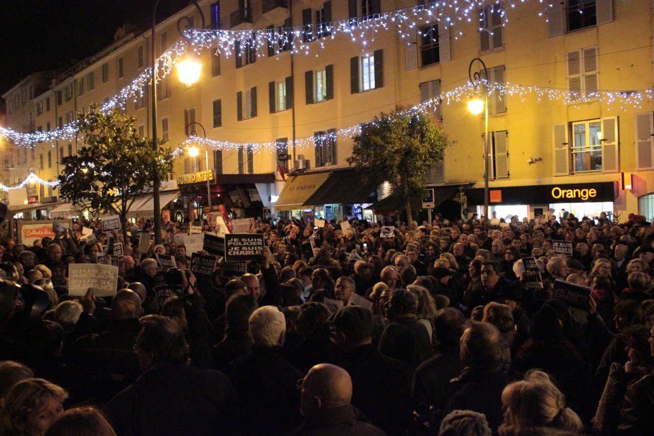 A l'heure où la France peine à panser ses plaies, sur le cours Napoléon, noir de monde, on se recueille. On se repasse le film de ces actes odieux. Le silence règne. Des dizaines d'écriteaux « Je suis Charlie » sont tenus à bout de bras. Trois mots qui ont envahis le monde depuis un peu plus de vingt quatre heures. Trois mois comme symbole du refus de voir la liberté sacrifiée sur l'autel de la violence. Du refus de la barbarie. Du refus de la haine.