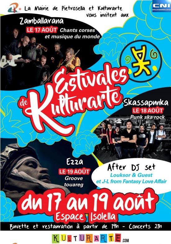 Les Estivales, se déroulent pour la 2ème année consécutive à l’Espace Isolella, avec le partenariat de la mairie de Pietrosella. Cet événement culturel axé autour de trois soirées vmusicales aux univers très différents. Cette année, Kulturarte va vous faire découvrir ou re-découvrir trois groupes aux sonorités très variées : Zamballarana, Skassapunka et Ezza.