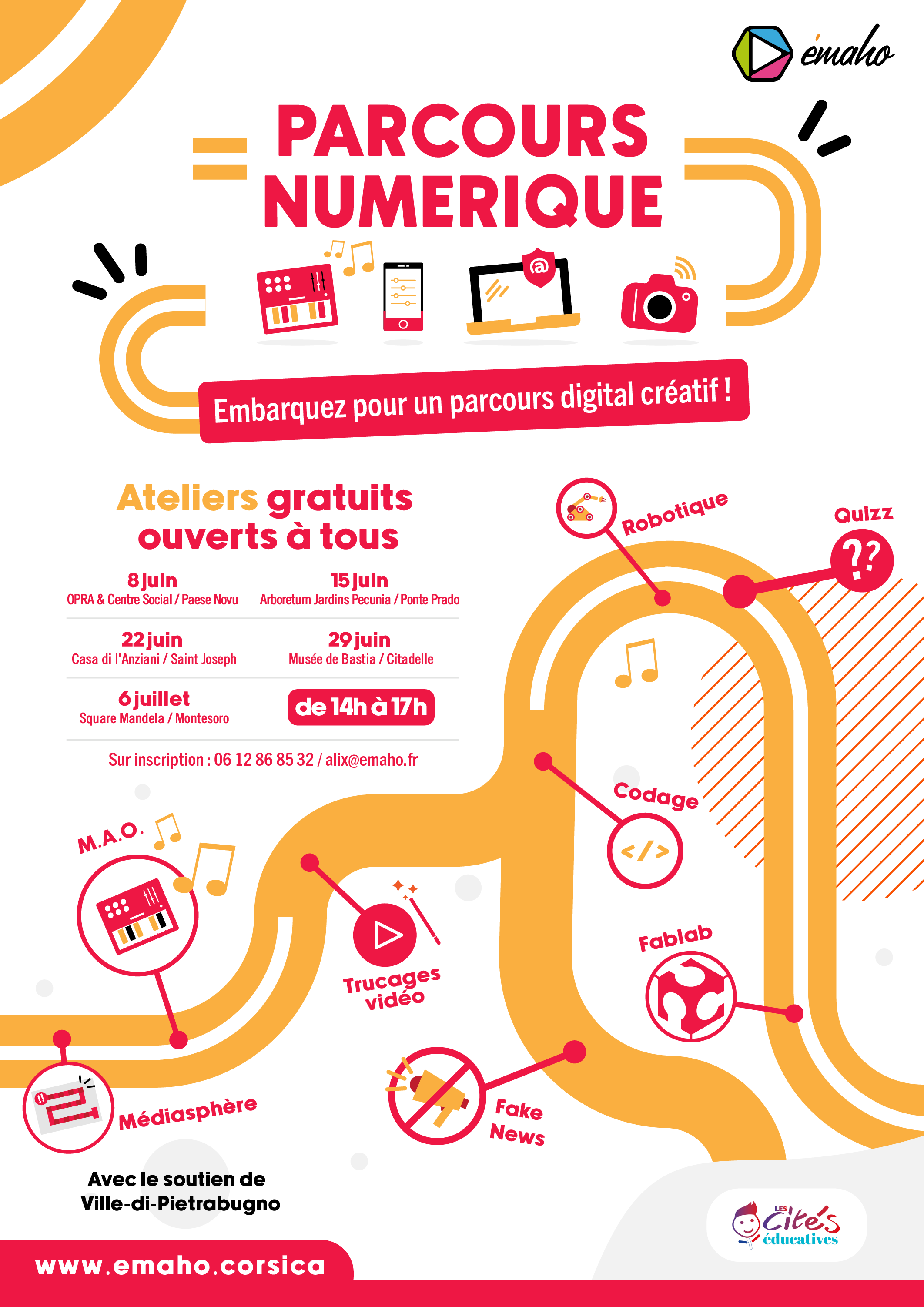« Nous reprenons cette année les ateliers numériques en extérieur à Bastia » explique Elodie Poignet, chargée de Production à Emaho, «Cette année ils prennent le nom de Parcours Numériques. Notre association imagine, conçoit, élabore et anime des temps de rencontres et d’échanges ayant pour objectif de transmettre expériences, savoir-faire et vocations autour des technologies numériques créatives. Chaque projet est donc pour nous l’occasion de connecter tout type de public en utilisant le meilleur des Technologies du Numérique, de l’Information et de la Communication. Nos actions ont pour but de replacer les nouvelles technologies au service de l’humain, pour créer du lien et initier des vocations aux métiers du numérique dans une démarche solidaire, sociale et innovante ».