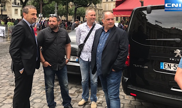 Les trois députés nationalistes, Jean-Félix Acquaviva, Michel Castellani et Paul-André Colombani, en compagnie de Gilles Simeoni, président de l’Exécutif territorial, Jean-Guy Talamoni, président de l’Assemblée de Corse, et Jean-Christophe Angelini, conseiller exécutif et président de l’ADEC.