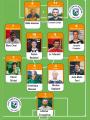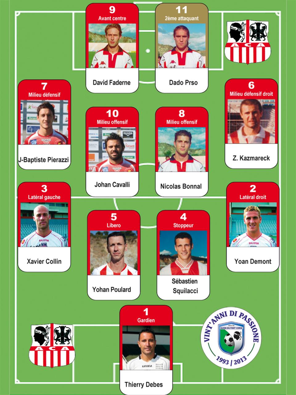 L’équipe type de l’AC Ajaccio : 1. Thierry Debes, 2. Yoan Demont, 3. Xavier Collin, 4. Sébastien Squilacci, 5. Yohan Poulard, 6. Z. Kazmareck, 7. JM. Pierazzi, 8. Nicolas Bonnal, 9. David Faderne, 10. Johan Cavalli, 11. Dado Prso.