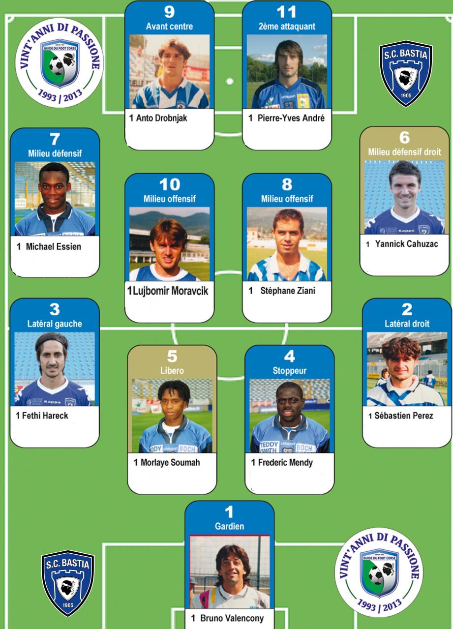 L’équipe type du SC Bastia est la suivante : N° 1 : Bruno Valencony, 2. Sebastien Perez, 3. Fethi Hareck, 4. Fréderic Mendy, 5. Morlaye Soumah, 6. Yannick Cahuzac, 7. Mickael Essien, 8. Stéphane Ziani, 9. Anto Drbnjak, 10. L. Moravcik, 11. Pierre-Yves André.