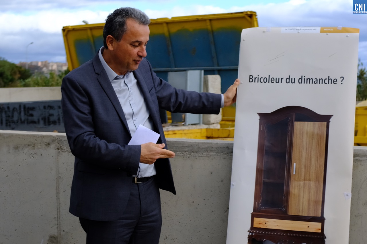 François Tatti, président du Syvadec et de la CAB, arrive à ce moment-là et lance à l’adresse de ses collaborateurs qui lui tendent le kakemono de présentation de l’opération : « Vous allez encore me faire jouer à l’homme sandwich ! » Rires et sourires autour de lui alors qu’il prend à son tour la parole : « Au milieu de ses nombreuses actions sur le développement durable, nous avons voulu mettre l’accent sur le recyclage des meubles. Il ne faut pas oublier que la Corse est une des premières régions de France à avoir mis en place cette filière, dès 2013. Et qu’elle représente à présent 25 kg par habitant, contre 8 sur le continent ! Bien sur, ce chiffre est influencé par la filière touristique mais il est aussi la preuve que le concept fonctionne parfaitement. » L’élu insiste : « Les modes de consommation changent, les mentalités en matière d’environnement aussi. J’en veux pour preuve le taux de recyclage en constante augmentation : 70% en 2017, 80% actuellement ! Je félicite d’ailleurs toutes le équipes qui œuvrent au quotidien dans nos déchetteries. » Il insiste sur le travail des services de revalorisation et en profite pour remercier François Bernardi, vice-président du Syvadec, à ses côtés pour l’occasion, sans oublier le service de communication qui a conçu la campagne.