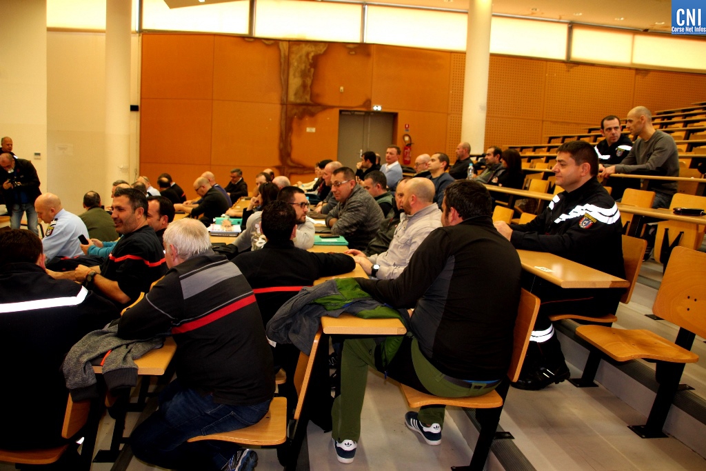 Ainsi tout au long de la matinée, les échanges se sont poursuivis entre les sapeurs-pompiers des deux ex-départements aujourd’hui réunis au sein d’une collectivité unique. Et côté collectivité unique, il a fallu attendre la restitution des travaux au sein de l’amphi « Ferrandu Ettori » afin de faire connaissance avec les deux nouveaux présidents des SIS 2A et 2B, Pierre Poli et Guy Armanet pour qui, c’était en quelque sorte le « baptême du feu ».