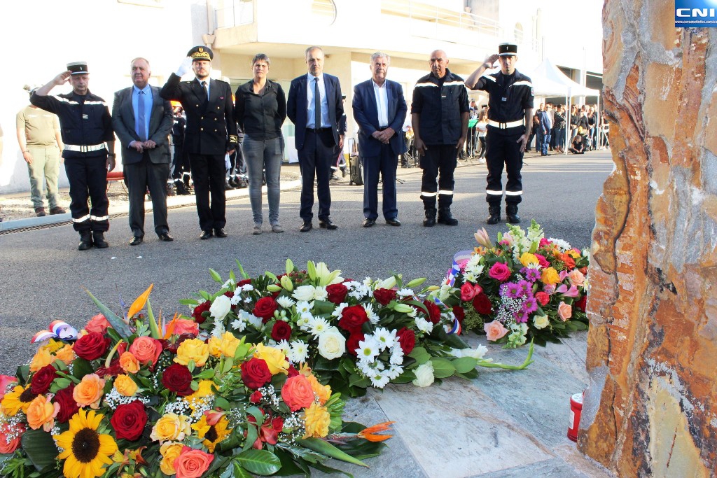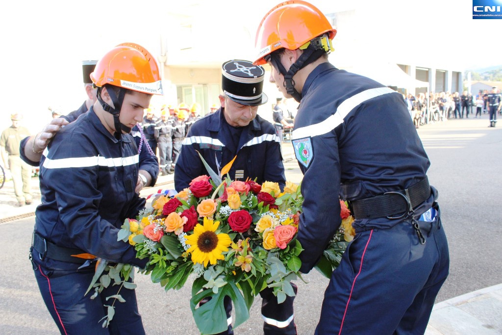 Cette première étape était suivie par une remise collective de médailles d’ancienneté et de cadeaux aux anciens chefs du centre de secours de Lucciana. Après quoi, un hommage solennel était rendu aux sapeurs-pompiers du Sdis 2b morts en service commandé et des gerbes déposées par les autorités au pied de la stèle où sont gravés les noms du sapeur Barthélémy Zamboni et du Caporal Raoul Begnini, morts dans l’accomplissement de leur devoir.