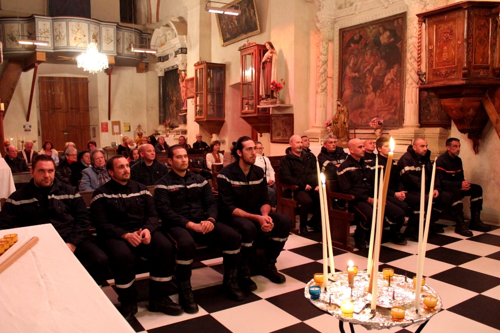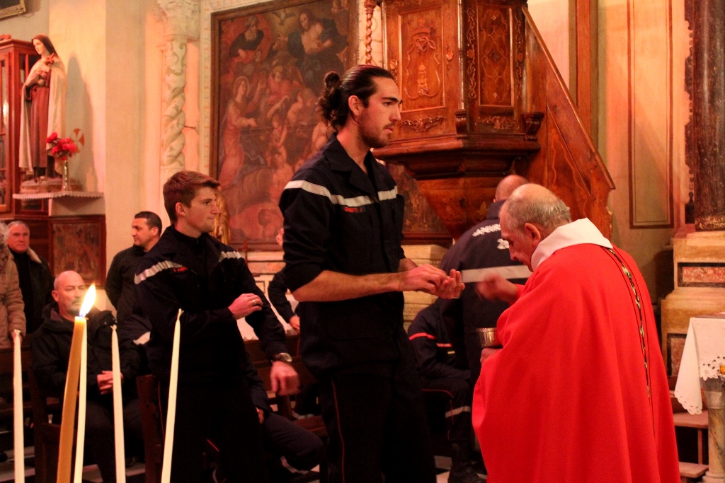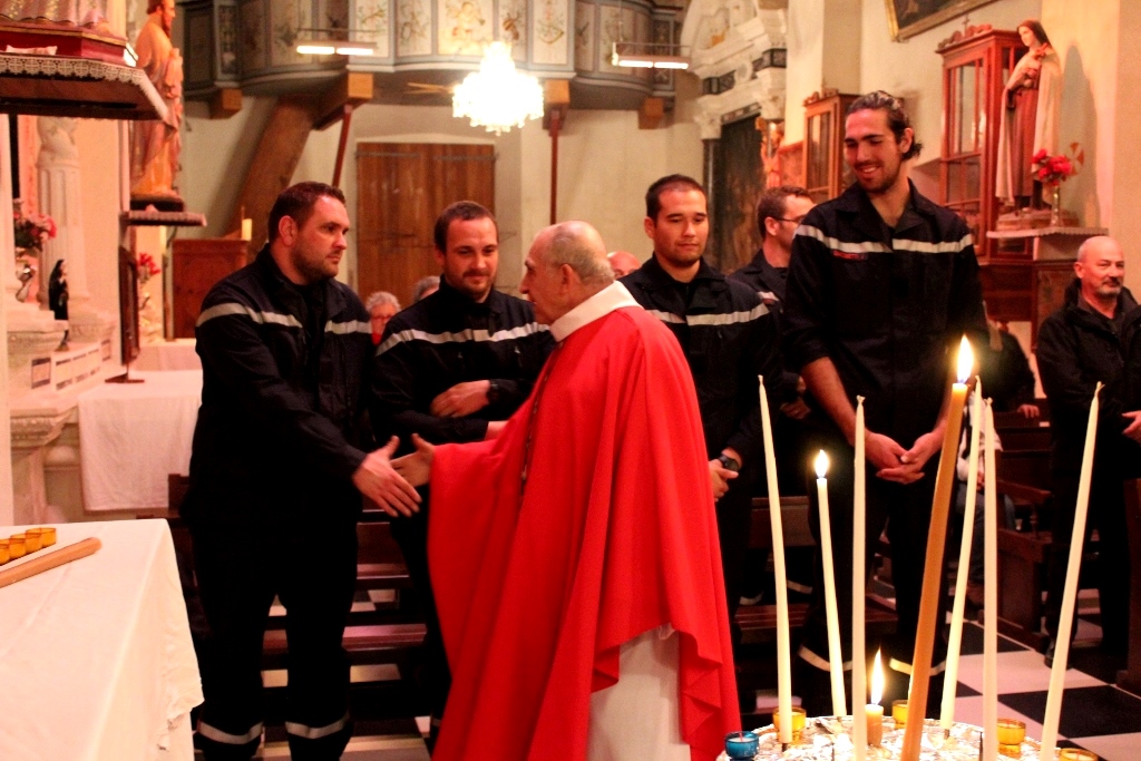 Les cérémonies ont débuté par une messe célébrée par le Père Gérard Squarcioni en l’église Saint-Nicolas en présence de nombreux habitants de la commune et des villages voisins. Dans son homélie, le curé de la paroisse a rappelé qui était Sainte-Barbe, martyre chrétienne qui est devenue la protectrice de bien des corps de métiers dont celui des soldats du feu. Puis d’adressant directement aux sapeurs-pompiers présents au premier rang, le Père Squarcioni, leur dit « Merci pour ce que vous êtes, mais aussi pour ce que vous faites au service d’autrui ».