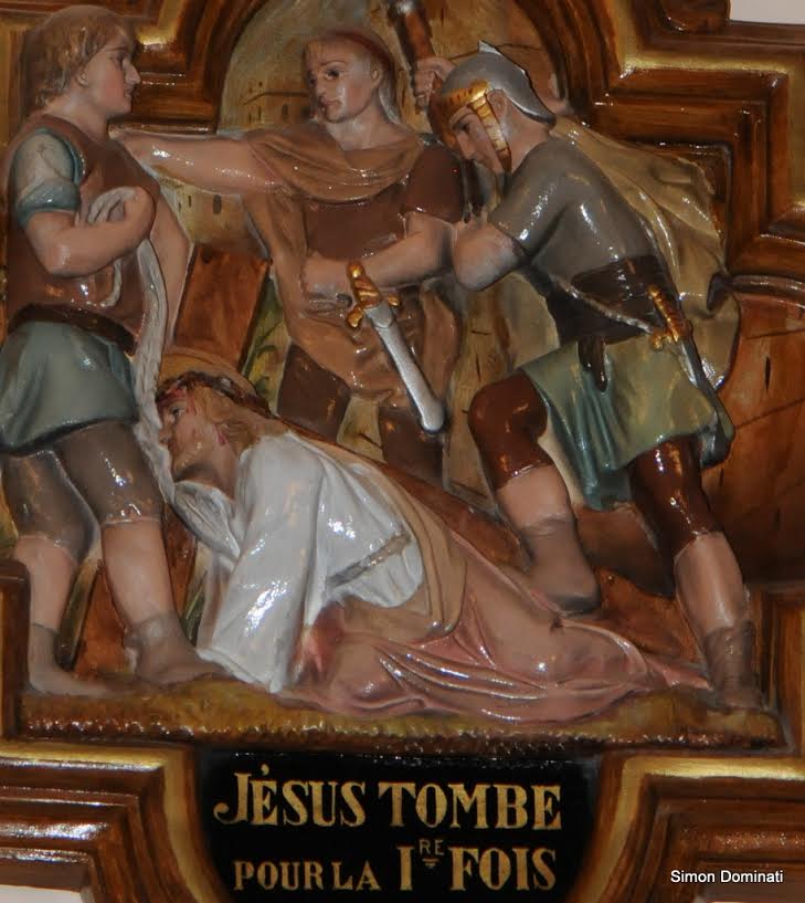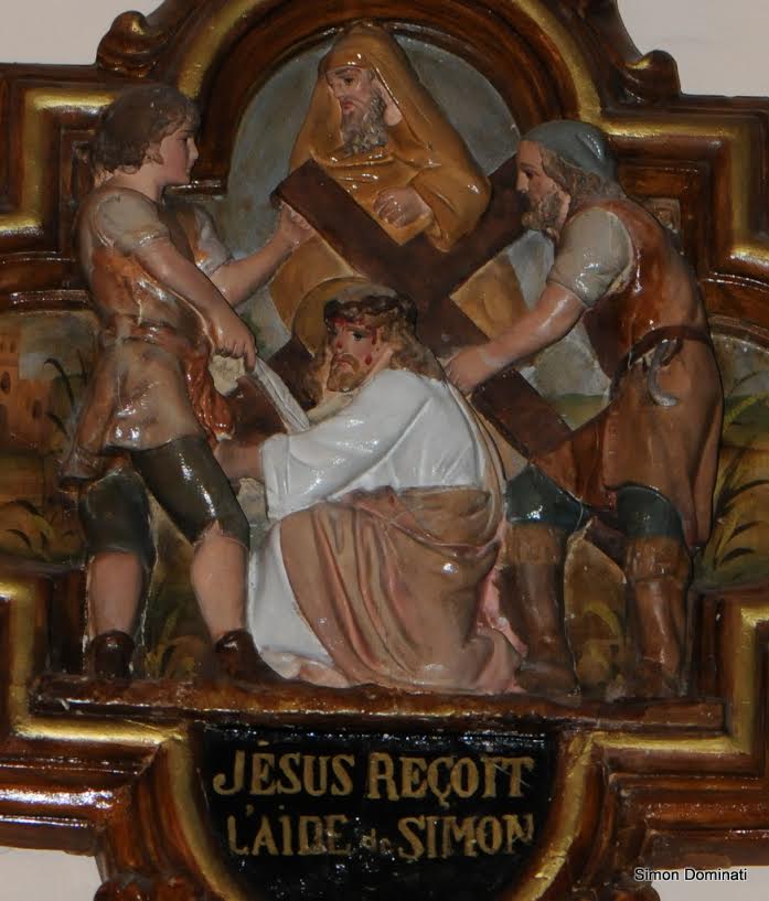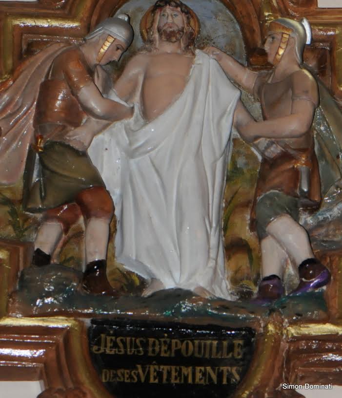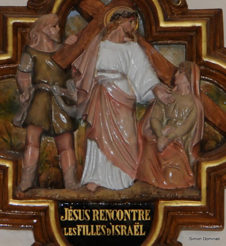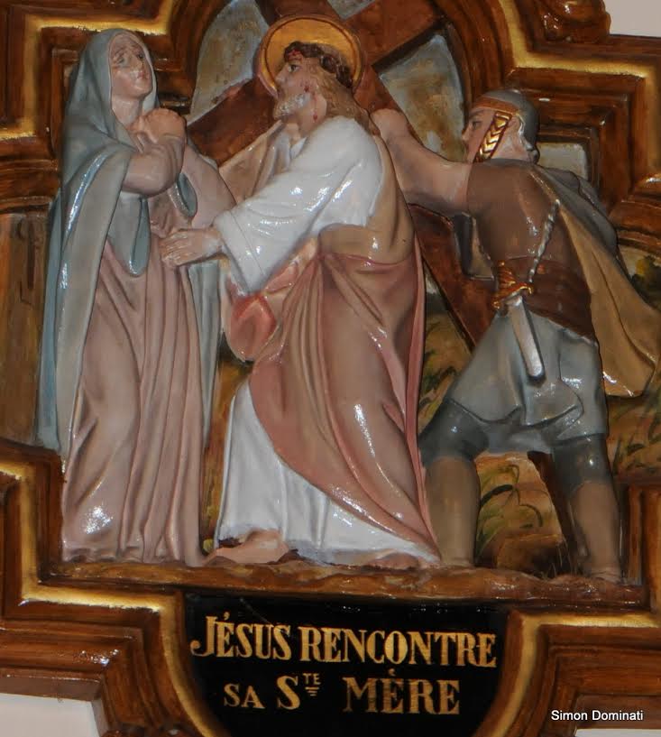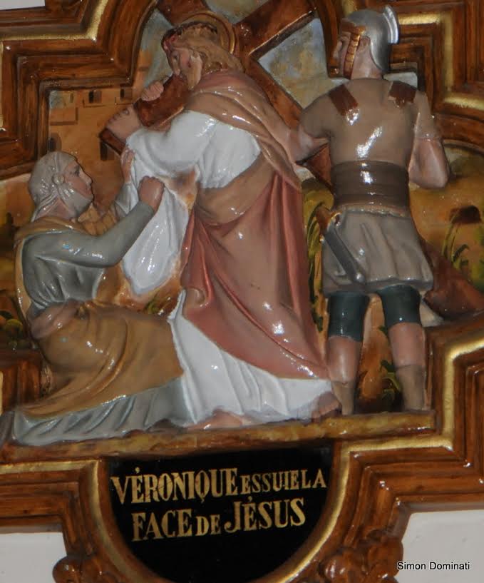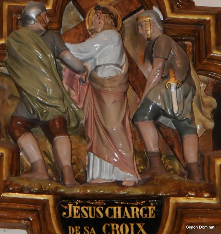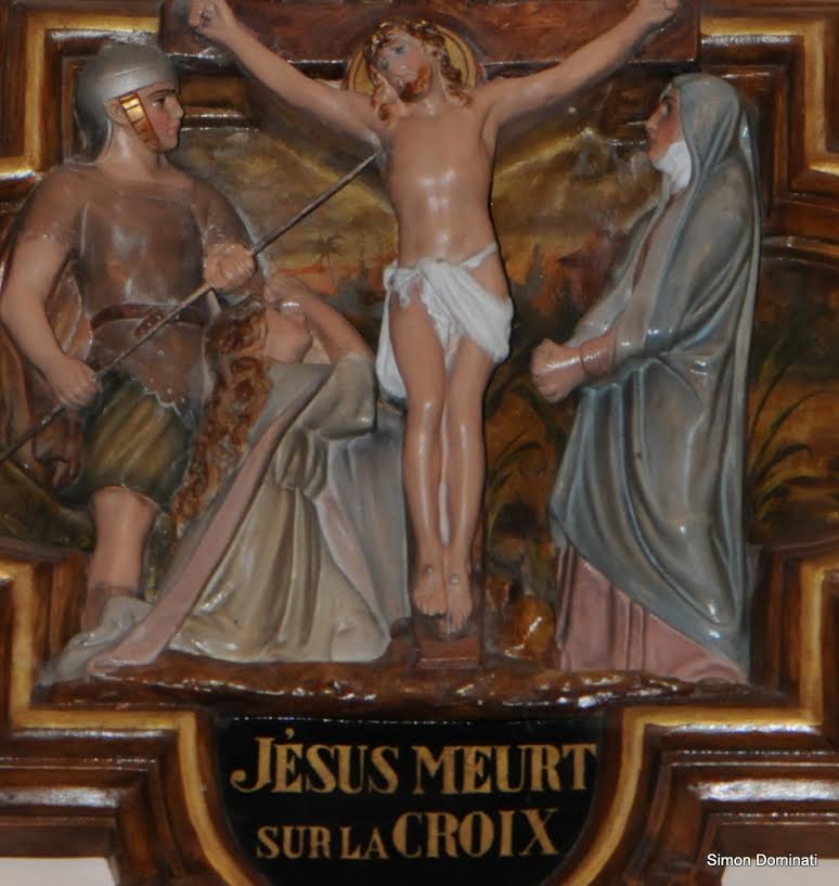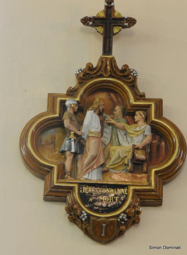 On y retrouve le chemin de croix que preti Lungaretti refaisait avec nous en parcourant les quatorze stations qui ceignent la nef depuis l’entrée gauche jusqu’à celle de droite. Après les vitraux flambants neufs, voici les scènes du chemin de croix telles que les plus assidues des paroissiennes ne les ont jamais vues.