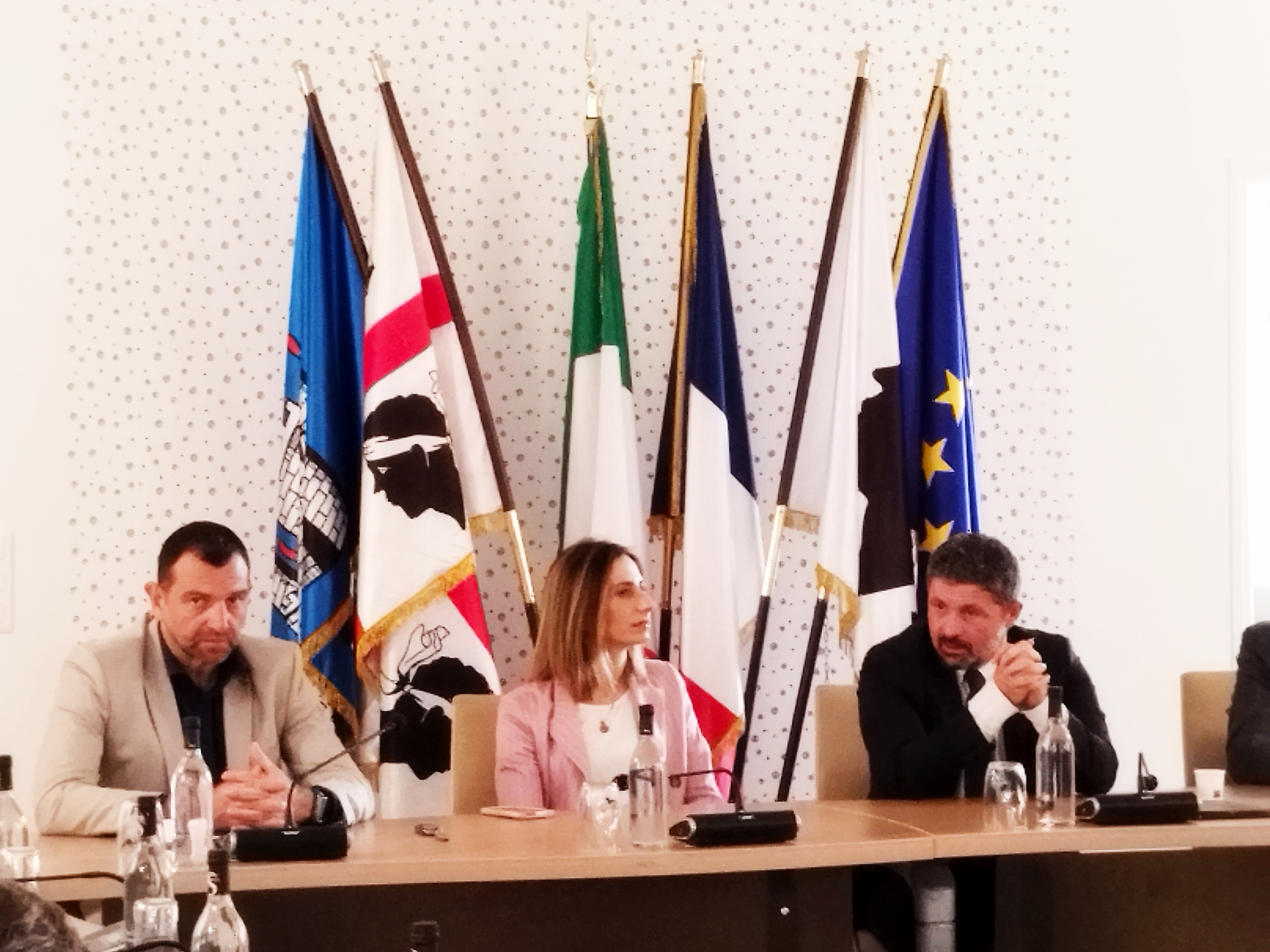 Mardi matin en mairie de Bonifacio, le maire Jean-Charles Orsucci (à gauche) a accueilli les deux élus préposés au transport : Barbara Manca pour la Sardaigne et Jean-Félix Acquaviva pour la Corse.