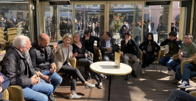 Nanette Maupertuis, présidente de l'Assemblée de Corse, et d'autres élus nationalistes discutent avec les jeunes manifestants, dans une brasserie à Aiacciu.