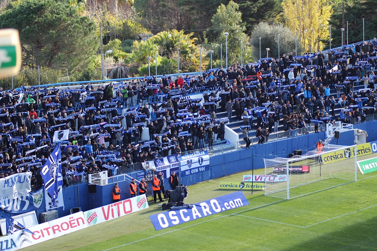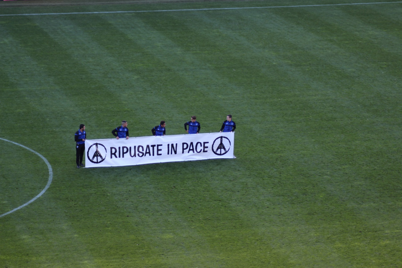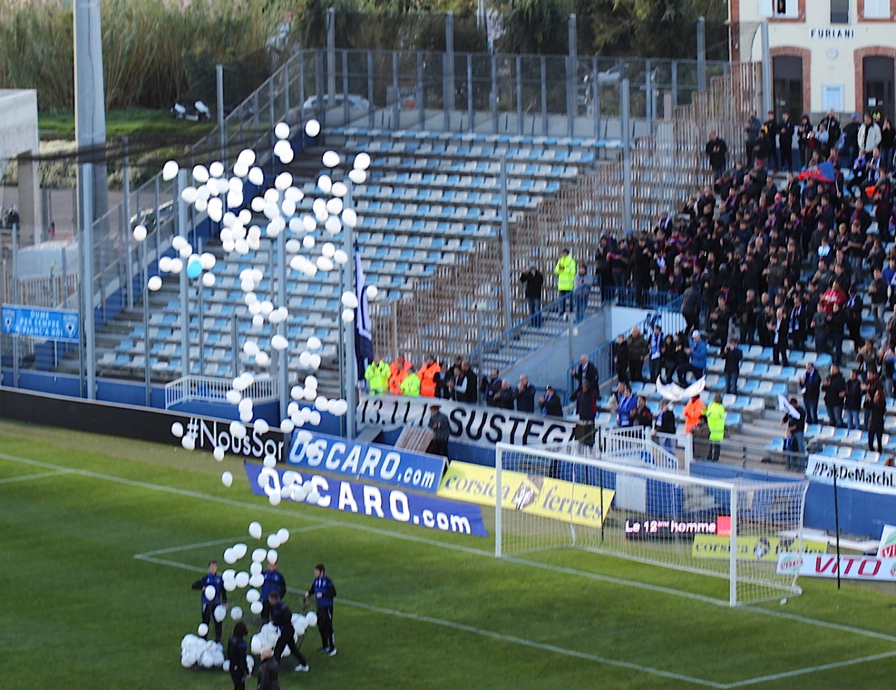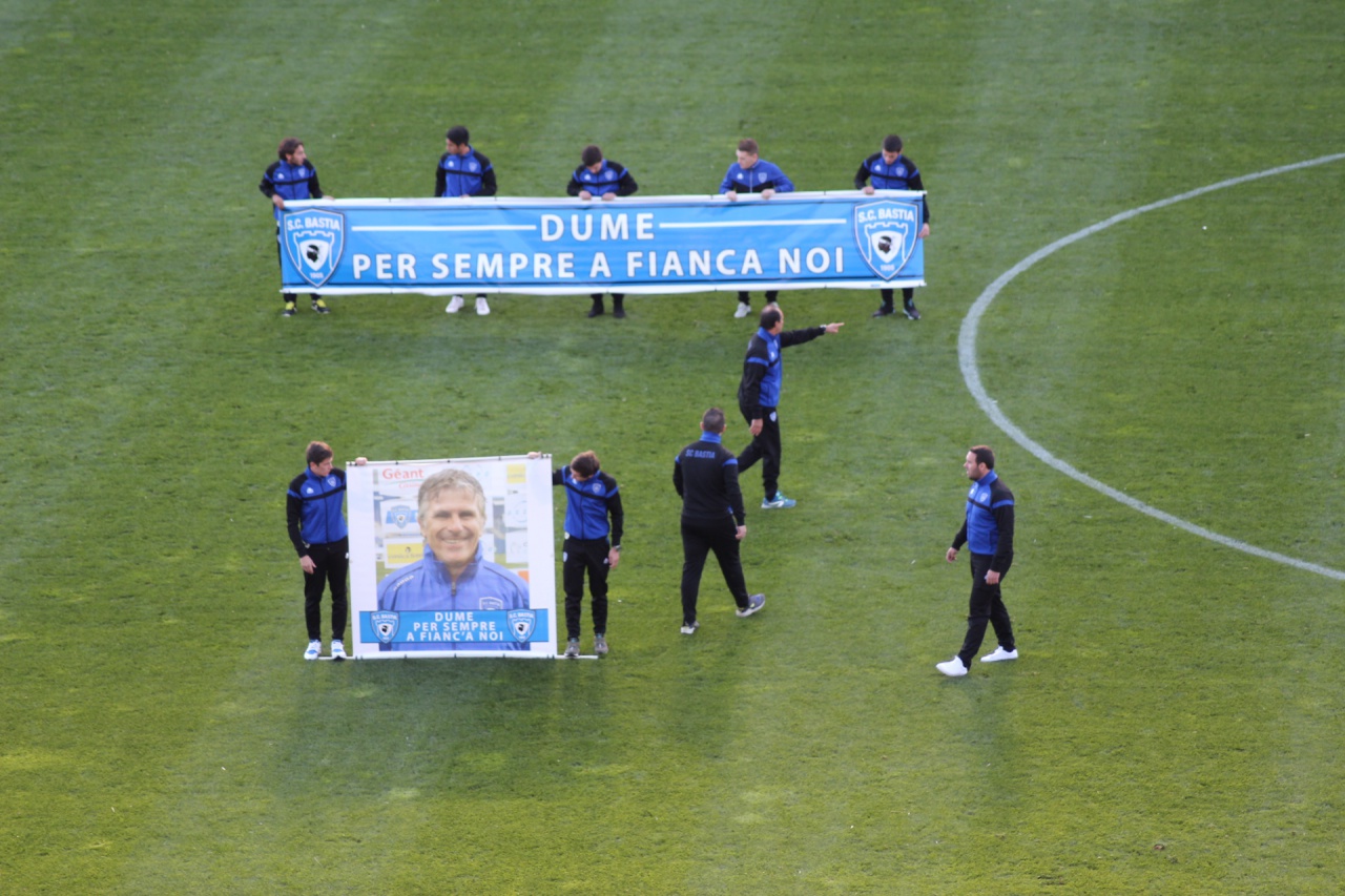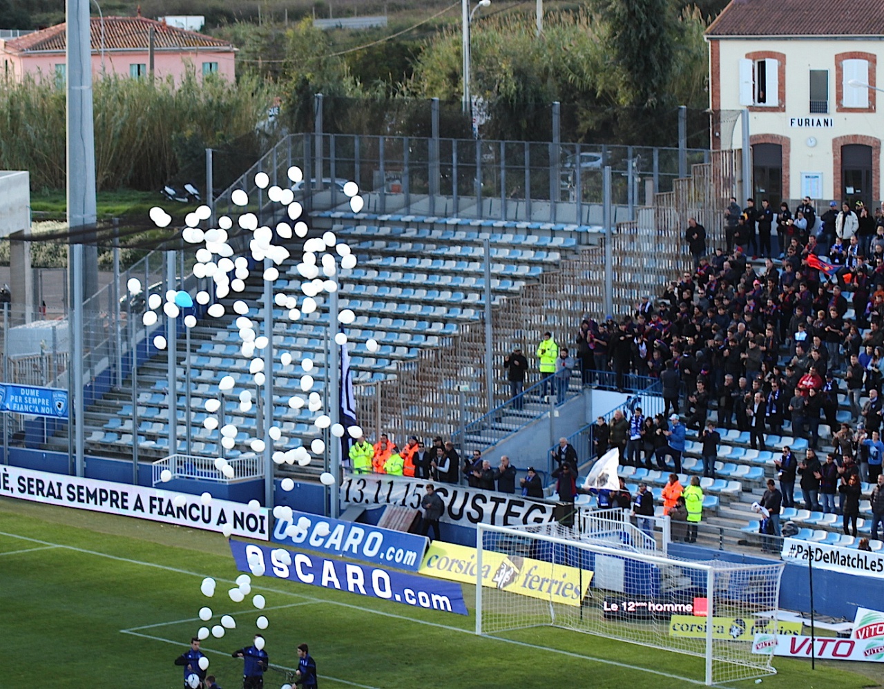 Déjà à la mise en place des deux banderoles " riposate in pace" avec le symbole rappelant les tragiques évènements de Paris et "Dume sempre fiancu a noi" à l'adresse de Dominique Albertini le regretté éducateur du club subitement disparu, des applaudissements nourris appelant au respect de l'instant à venir, ont parcouru Furiani.