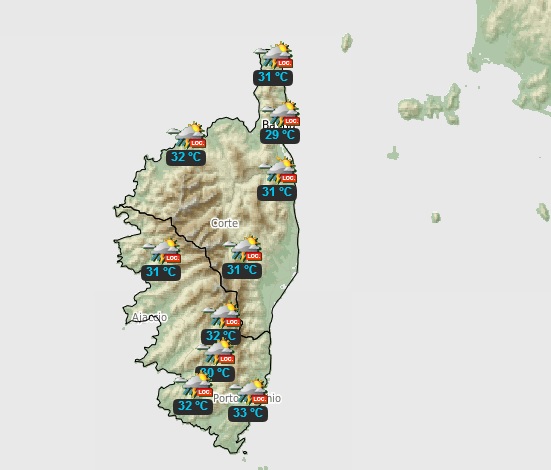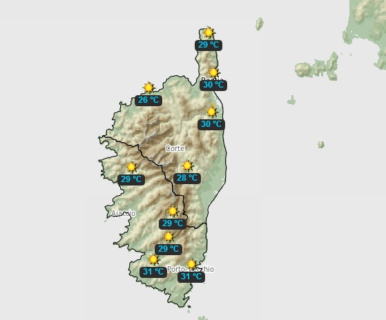 Légère dégradation du temps à l’entame de ce week-end. Du soleil en début de journée de samedi puis des nuages se développeront donnant des averses. Elles prendront un caractère orageux et plus généralisées dimanche. Le vent plutôt faible samedi, s’orientera au secteur NW dimanche, devenant modéré dans le Cap Corse et sur le nord de l’île en général. Sensation de lourdeur en ces deux jours avec des maximales atteignant jusqu’à 35 degrés dans le centre.