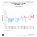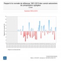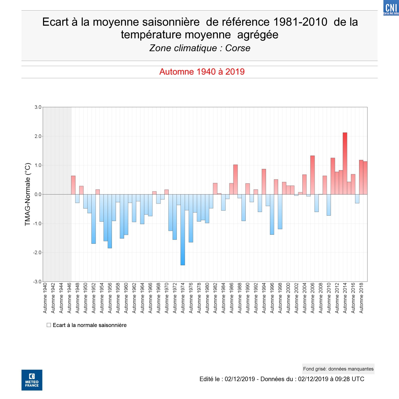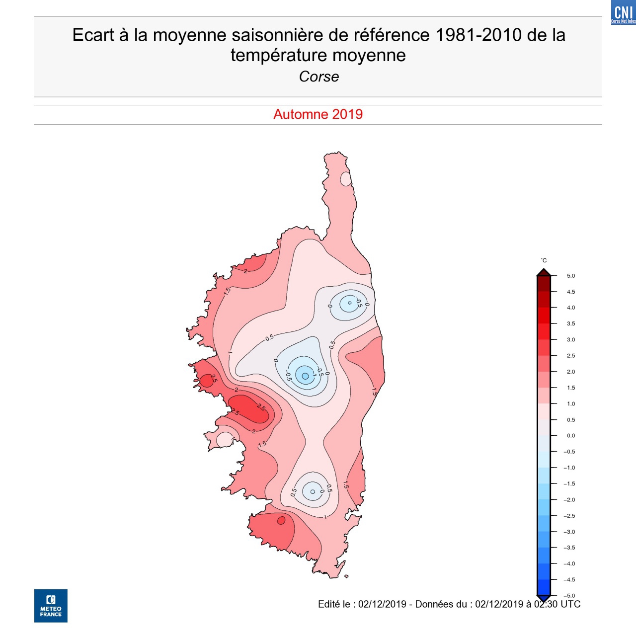 - L’automne 2019 sur la Corse montre des températures de 1.1 degré au dessus des normales. Mais le littoral, notamment occidental, présente des écarts à la normale plus élevés : 2,5 degrés sur la partie ouest et 1,5 degrés sur la partie Est.