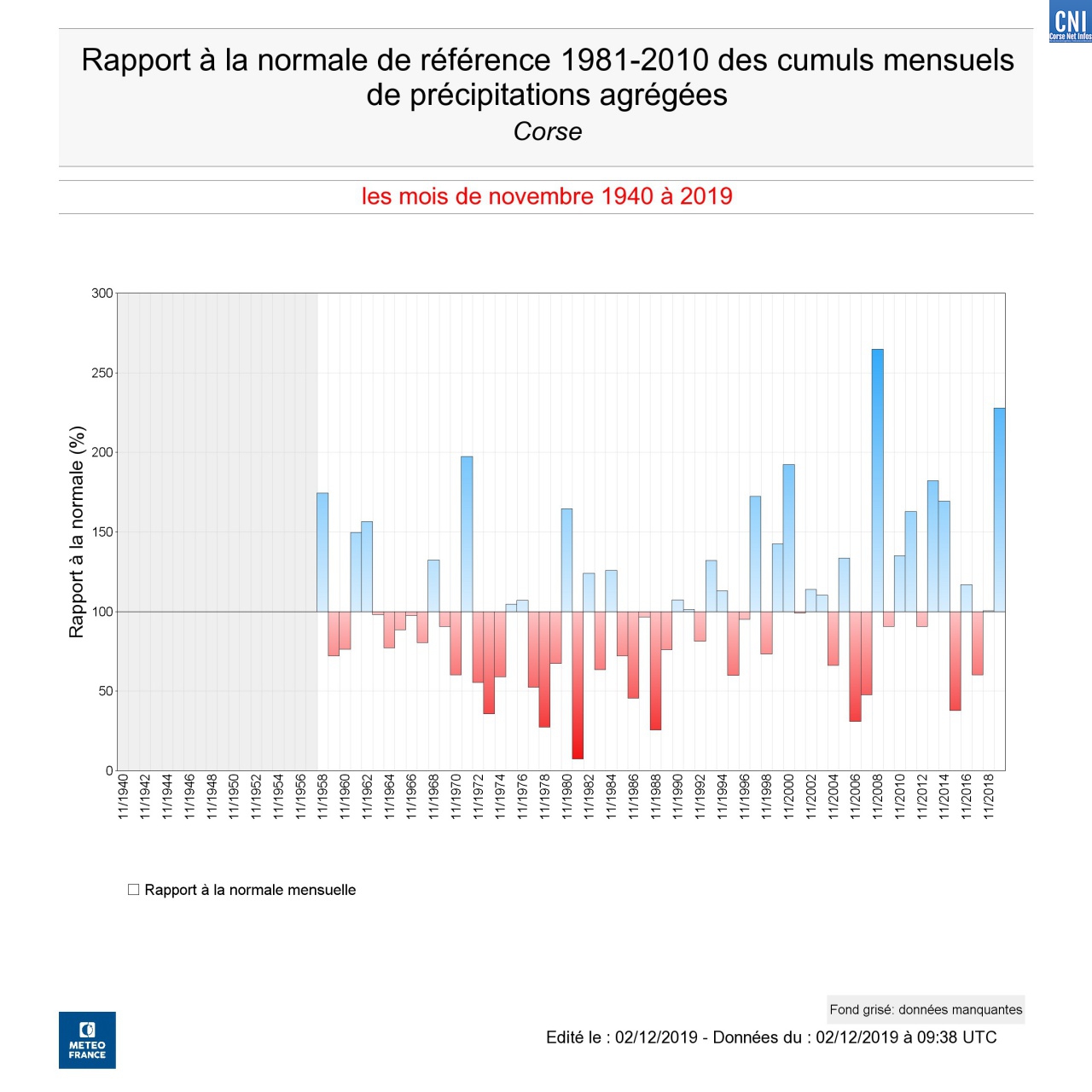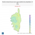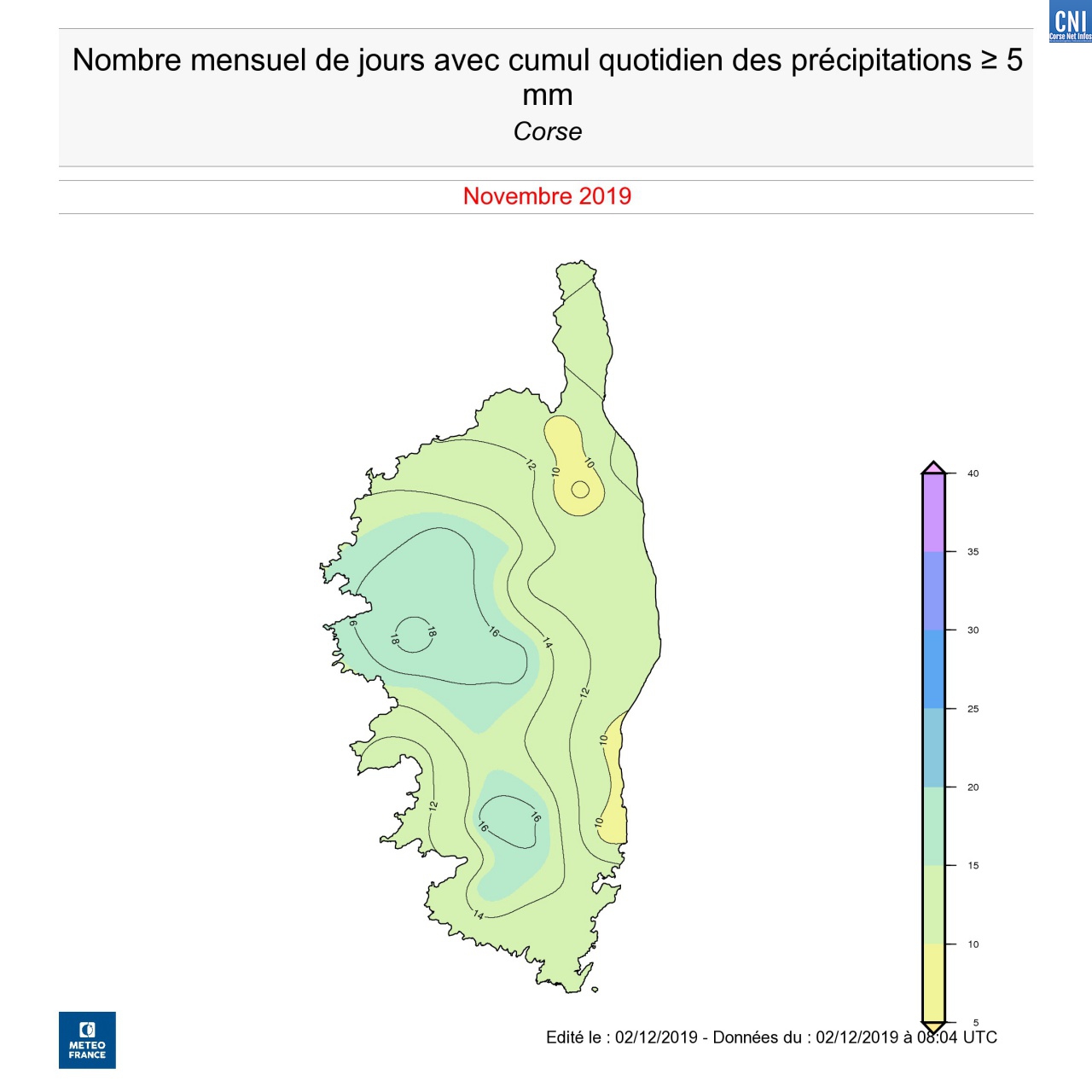 - Il est tombé en moyenne sur la Corse 299 mm soit 228% de la normale. Le record absolu reste toutefois novembre 2008 avec 346 mm soit 265 % de la normale. A noter que ce mois de novembre a compté entre 10 à 18 jours de pluie supplémentaires contre 10 à 14 jours pour novembre 2008