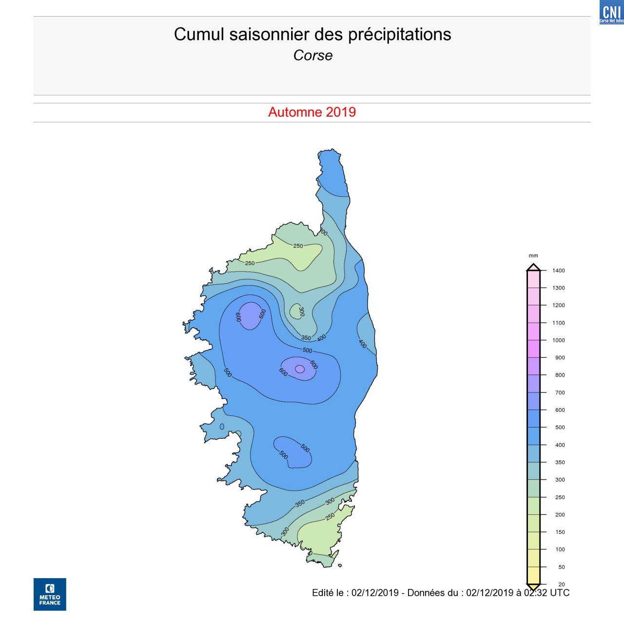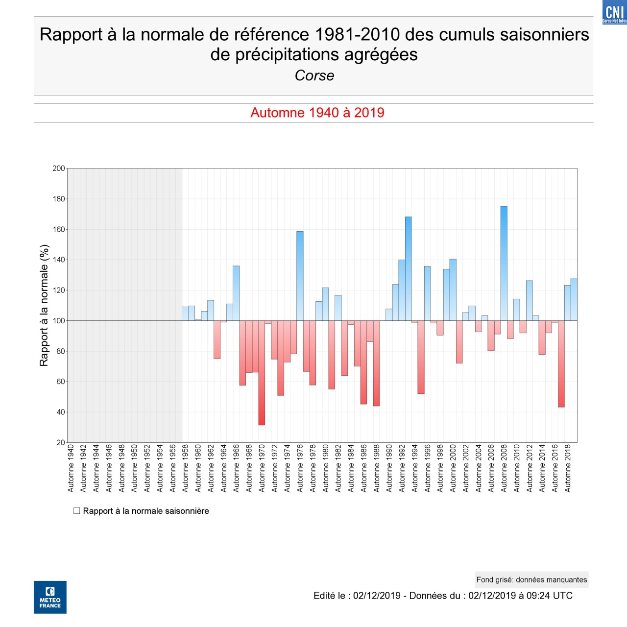 - Grâce à ce mois de novembre très arrosé, et finalement bienvenu, la Corse recueille 417 mm d’eau en cet automne 2019 soit 128% de la normale. Rien de très remarquable en fait.