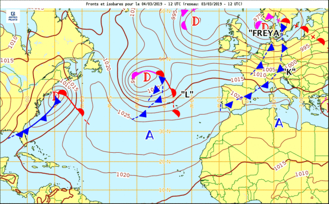L’anticyclone centré sur l’Espagne se décale sur l’atlantique et ne fait donc plus obstacle aux perturbations venant du nord. Toutefois ces perturbations n’intéresseront pas la Corse