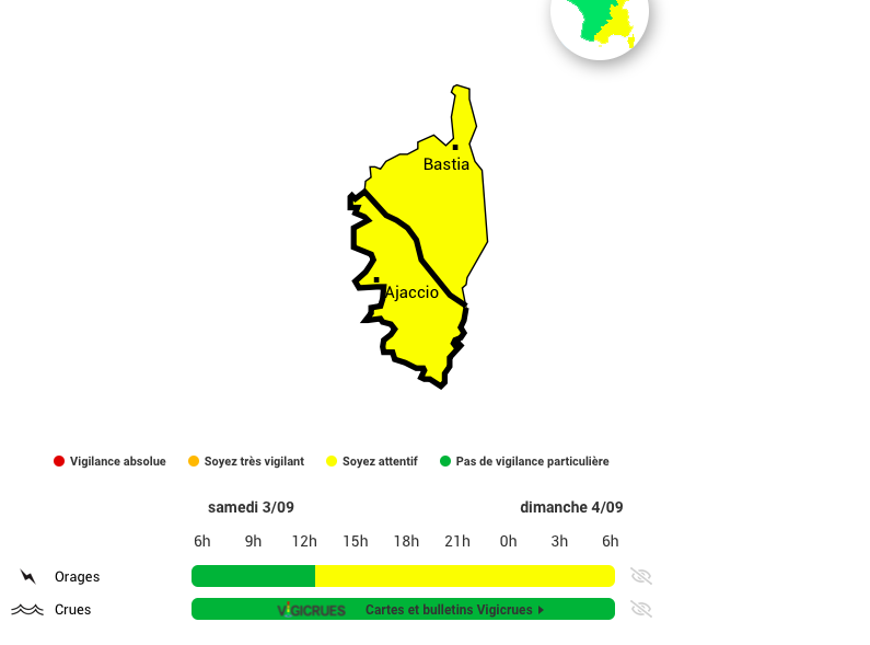 Le temps reste à l'orage sur l'est du pays, avec des résidus orageux encore bien actifs en Corse ce matin. L'après-midi, des averses orageuses s'organisent de nouveau sur l'ile : ces orages peuvent être localement forts et donner de bons cumuls de précipitations. Les températures minimales vont de 20 à 21 degrés. Les valeurs maximales dans l'après-midi sont entre 30 à 32 degrés en Corse.