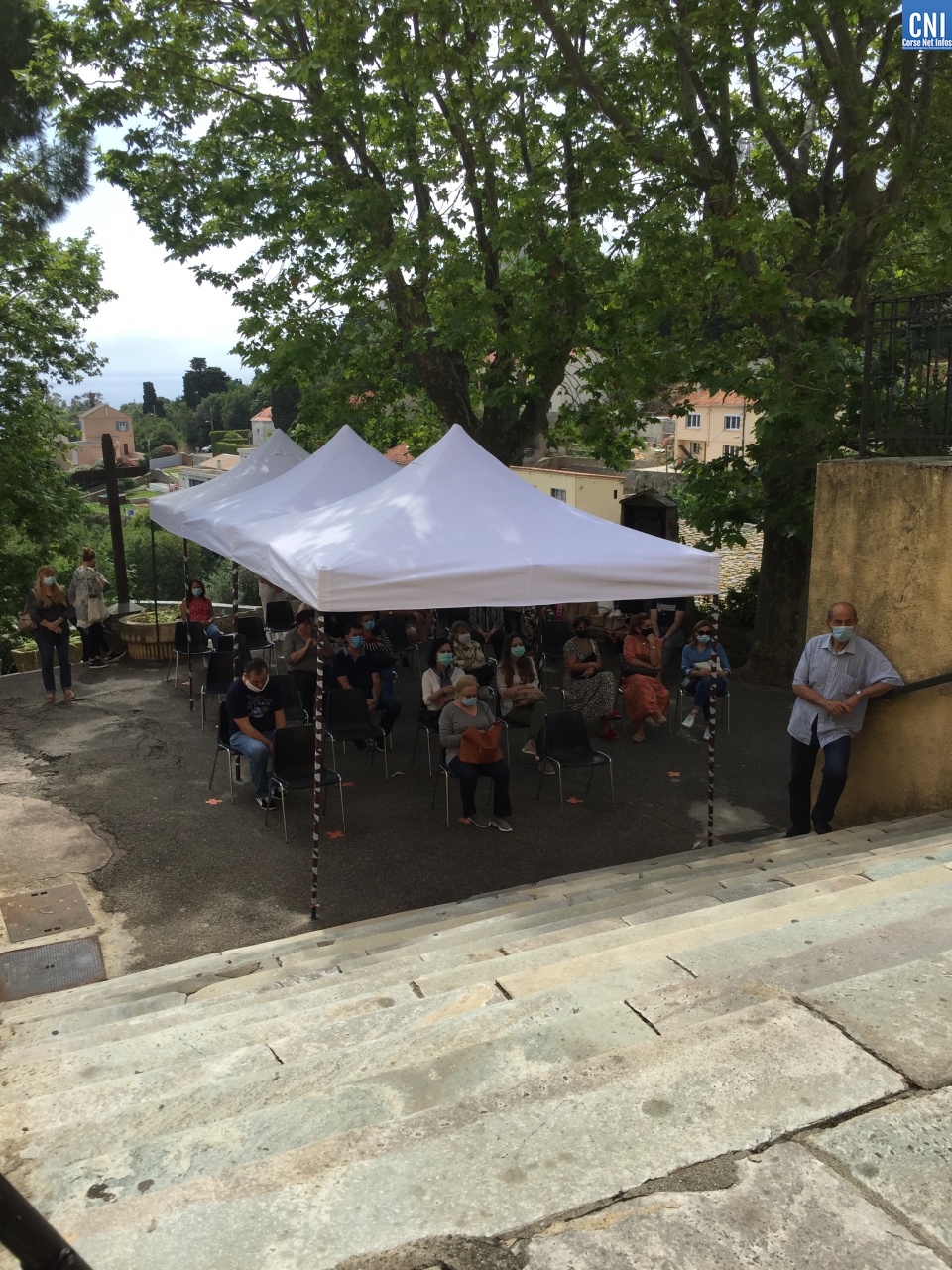 A l’extérieur, des tentes et des sièges avaient été installés afin qu’une cinquantaine de fidèles puissent suivre la messe, via des haut-parleurs diffusant la retransmission en direct sur les ondes de Radio Salve Regina.