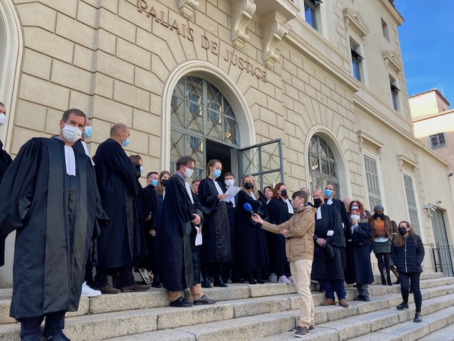 « On ne pourra pas rendre une justice de qualité avec un manque de moyens », assure Danielle Sbraggia, délégué régionale de l’Union syndicale des magistrats devant le tribunal de Bastia. Derrière elle, avocats, greffiers, magistrat, président du tribunal, procureur général, représentants syndicaux se sont rassemblés ce mercredi 15 décembre pour dénoncer un système judiciaire de plus en plus précaire. Les professionnels de la justice en Corse ont suivi l’appel national organisé par l’intersyndicale composée d’un peu moins d’une vingtaine d’organisations en réponse à une tribune du 23 novembre 2021 publiée chez nos confrères du journal Le Monde. Dans cette tribune 6 000 magistrats et fonctionnaires pointaient les souffrances engendrées par le manque de moyens et l’atteinte aux intérêts du justiciable.