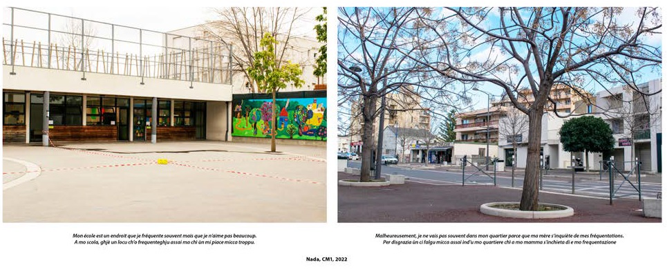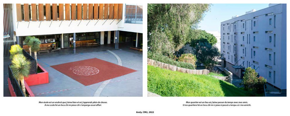 Les clichés numériques des élèves ont ensuite été projetés en salle de classe afin que chacun puisse sélectionner ses photographies et créer un diptyque. En collaboration avec leur professeur, chaque élève a écrit une légende bilingue français-corse pour exprimer sa vision sur l’école et le quartier. « Le texte dans lequel ils ont imaginé l’avenir de leur école et de leur quartier dans 50 ans, est le produit d’un travail commun » indique pour sa part Fabienne Gianecchini, directrice de l’école.