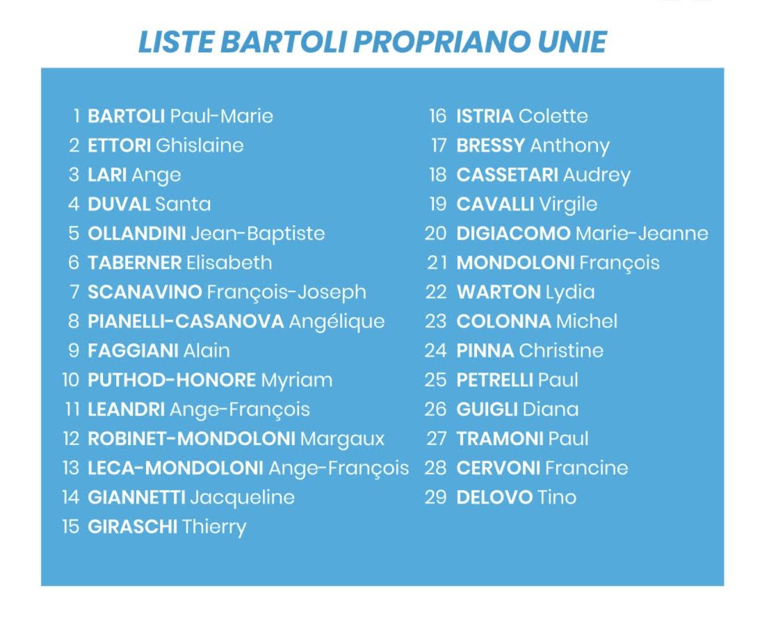 - Comme en 2001, en 2008, et en 2014, je conduis une liste sans étiquette, regroupant des femmes et des hommes de diverses sensibilités politiques et issus de la société civile. Nous avons toujours placé l’intérêt supérieur de Propriano avant toutes considérations politiques et partisanes qui au niveau communal ne peuvent engendrer que des divisions stériles. Au contraire, notre objectif est d’unir les proprianaises et les proprianais autour de notre projet.