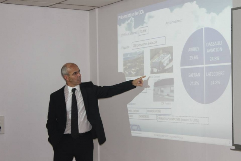 La société Corse Composites Aéronautiques ou CCA est une entreprise de 250 salariés dont le chiffre d’affaire avoisine les 40 millions d’euros. Sa maison mère est située dans la zone industrielle du Vazzio à Ajaccio. Les quatre actionnaires à part quasi égale sont Airbus pour 25,6% et Dassault, Safran et Lacoere pour 24,8% chacun.