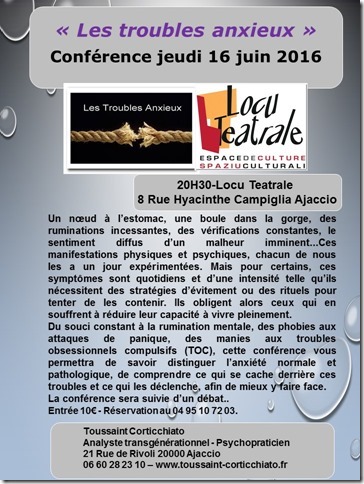 Le jeudi 16 juin 2016 à 20h30 à Locu Téatrale Toussaint Corticchiato animera une conférence suivie d'un débat sur les troubles anxieux.