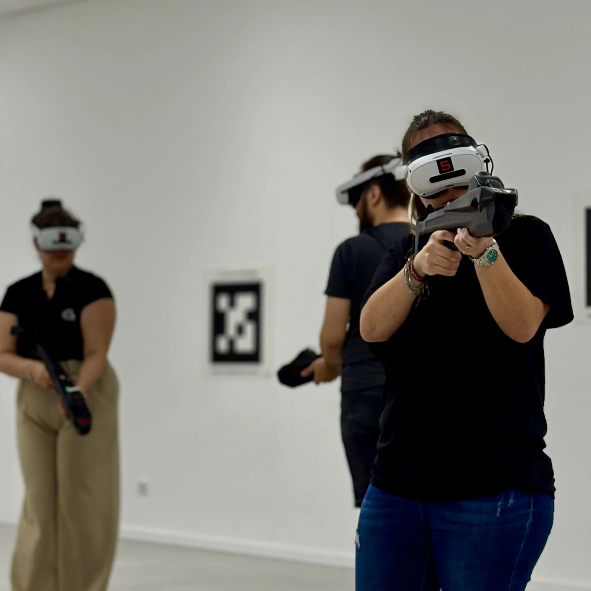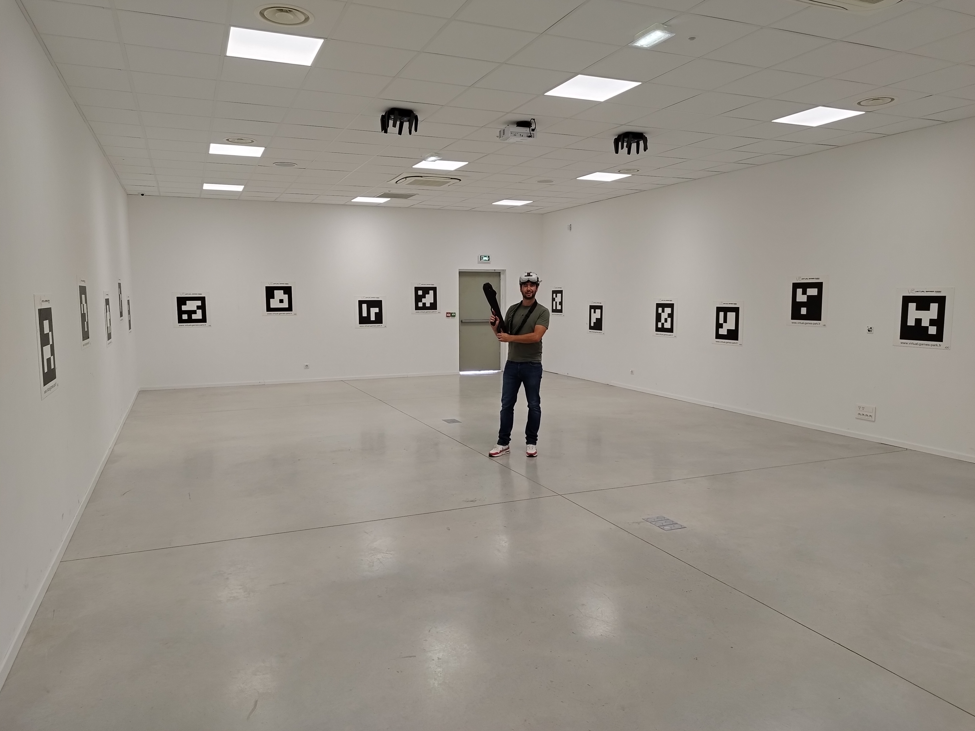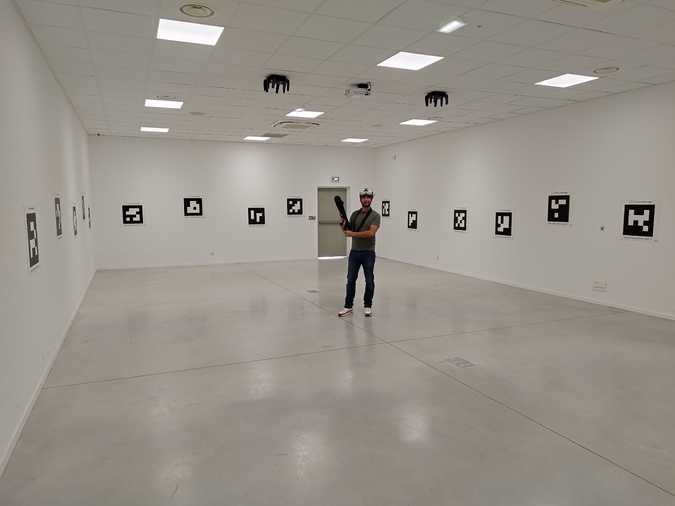 Le Galaxy a transformé sa salle de séminaire de 100 m2 en aire de jeu virtuelle. Au mur, il y a des QR-Codes de partout, qui modélisent l’univers virtuel dans lequel on est immergé en se connectant à des caméras situées sur les casques. Mais une fois que le jeu est lancé, on se retrouve dans une base scientifique en feu, où déboulent des hordes de zombies. L’expérience est tout aussi prenante que surprenante : pendant toute la partie, on tourne sur nous-même à 360 degrés, pour être sûr de ne pas se laisser piéger par l’un de ces cadavres animés. Mais il arrive on détale et trop captivé par l’action, j’en oublie parfois que je me trouve en réalité dans une pièce carrée aseptisée… jusqu’à ce que les murs me le rappellent. Fort heureusement, c’est généralement le pistolet-mitrailleur qui prend (étant donné qu’on le porte devant), ce qui m’amène à mieux comprendre les traces de peinture noire sur les murs que j’avais entraperçues ici ou là. C’est un problème de débutant, car la réalité virtuelle signale bien aux joueurs les limites physiques de l’aire de jeu, et en tentant de conserver la tête froide, j’ai fini par arrêter de me cogner.