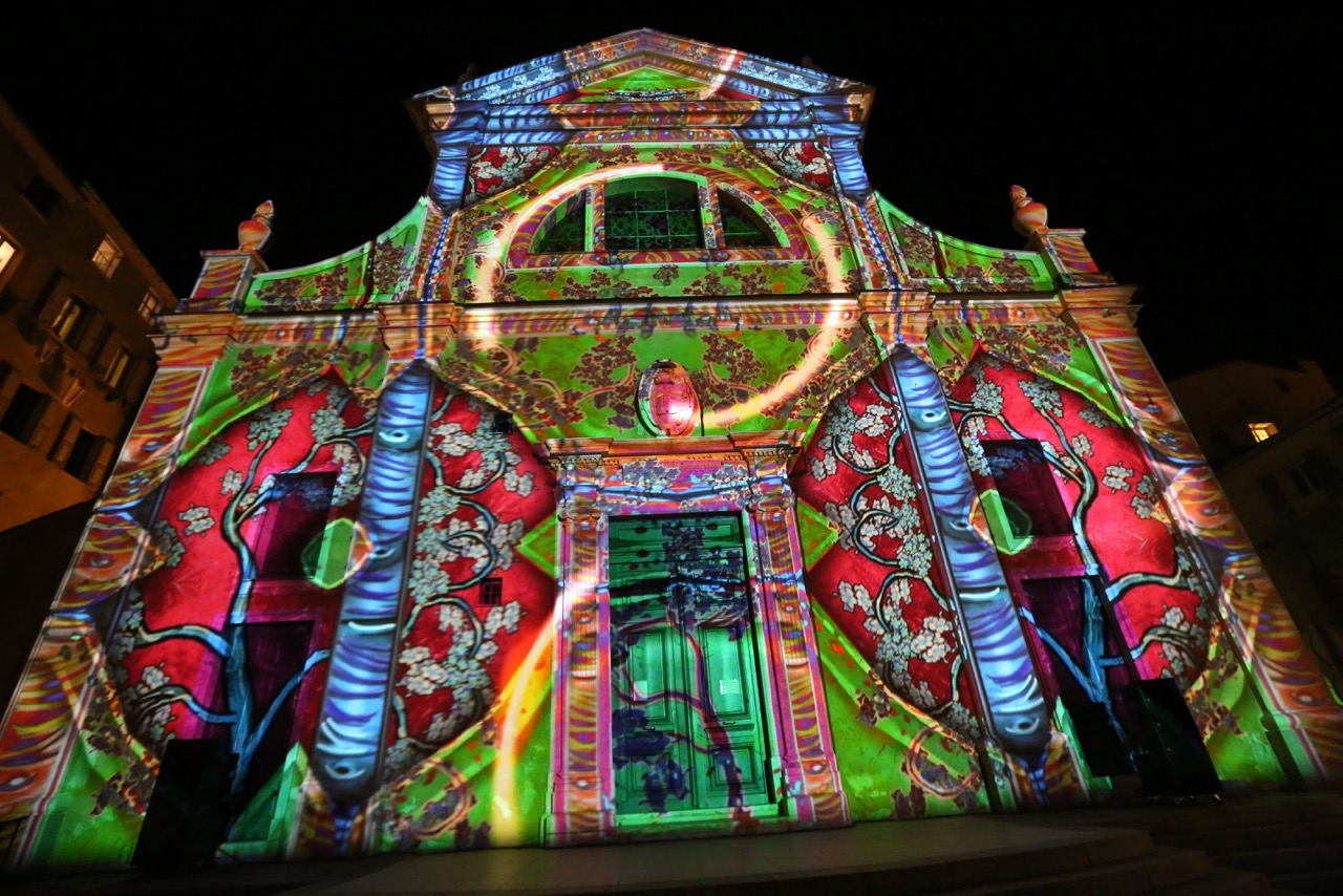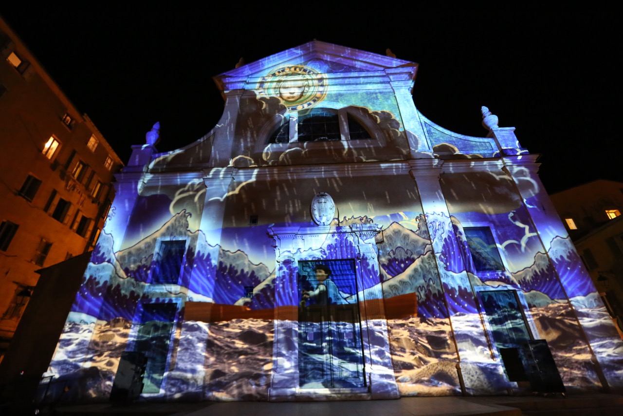 Alors que la nuit épaisse tombe sur le palais Fesch et que s’éteignent définitivement les éclairages de ses façades, de mystérieuses petites lucioles font leur entrée. Elles illuminent dans leur sillage des pans de murs entiers, s’engouffrent dans les ouvertures des portes et des fenêtres de l’édifice, avant de ressortir plus loin sur le fronton du musée. Habitantes fragiles des campagnes, leur seule présence au cœur de la ville d’Ajaccio préfigure déjà l'ambiance magique qui va venir enrober tout le spectacle à venir. Le musée semble ainsi habité d’une myriade de scintillements se reflétant sur ses parois. A travers ce fantastique ballet de lumières, c’est finalement l’antre secret des lieux qui lentement émerge, donnant l’impression de se déverser sur la façade extérieure, un peu comme si les murs s'ouvraient au passage des lucioles et offraient un regard sur des intérieurs pourtant habituellement cachés et inertes. Puis, les lucioles tirent leur révérence, disparaissant au firmament de la façade.