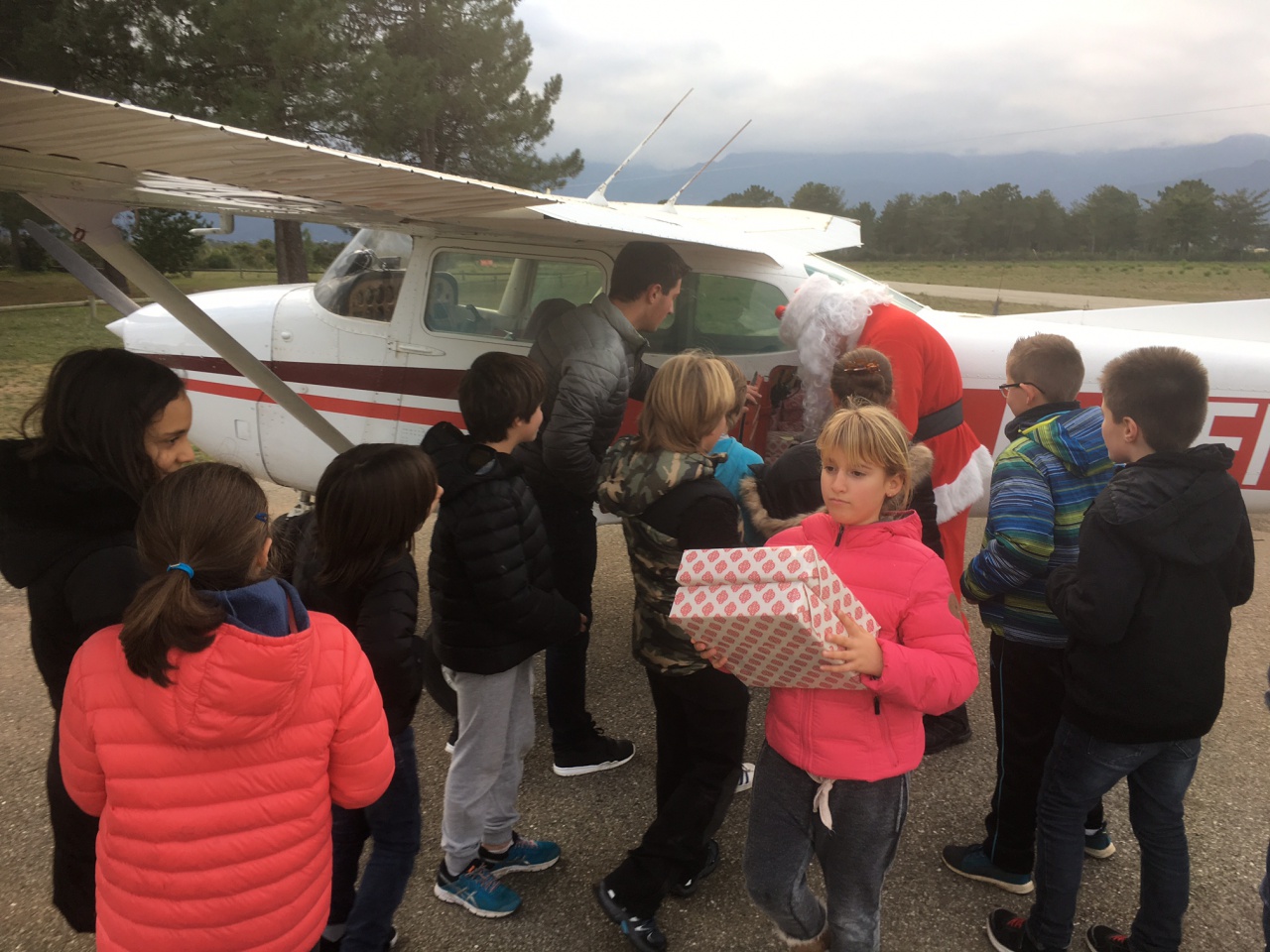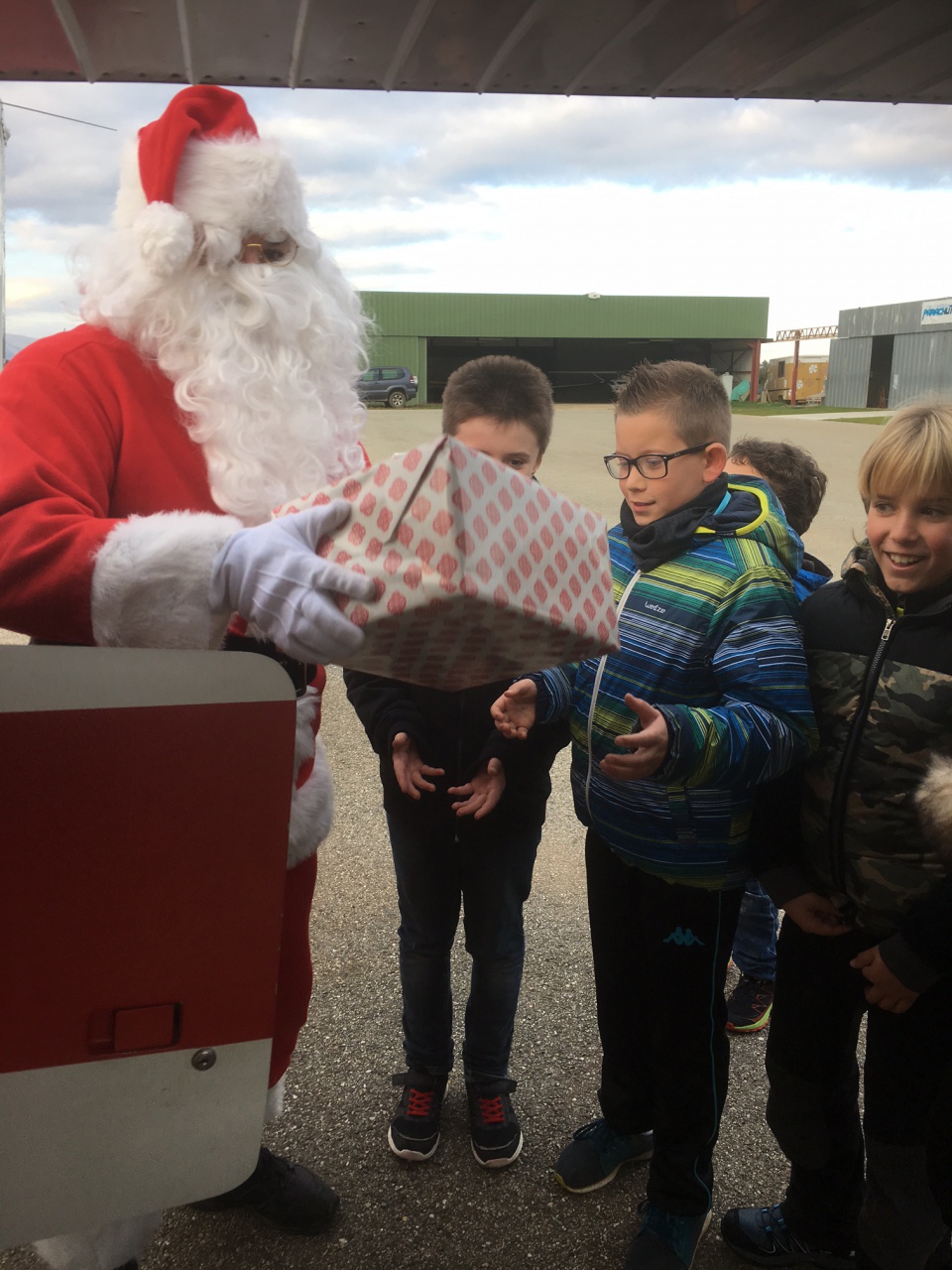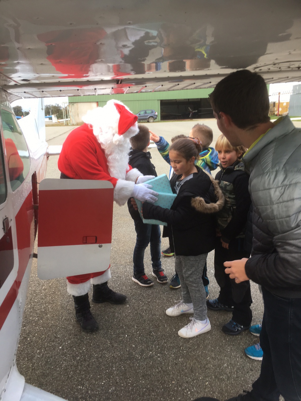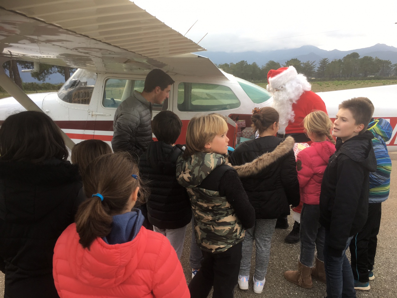 Dès le moteur stoppé, le vieux monsieur à la grande barbe blanche si heureux d'enchanter les petits comme les grands, est rapidement descendu de son siège pour aller ouvrir la soute et demander aux enfants de transporter les cadeaux sous le sapin de Noël, à l'intérieur du club-house de l'aéroclub Ghisonaccia-Alzitone.