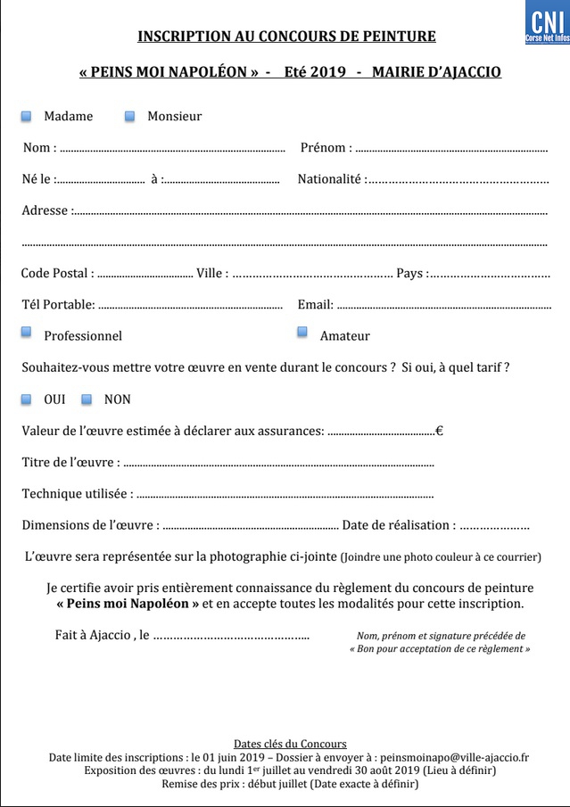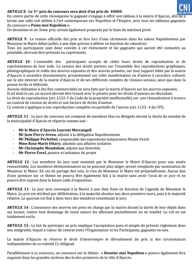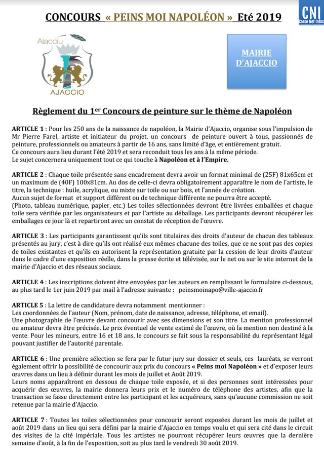 Sous l’impulsion de l'artiste Pierre Farel, de Philippe Perfettini, responsable des expositions temporaires du Musée Fesch, et d'Aresu Jean Pierre, adjoint à la délégation Napoléonienne, la Mairie d’Ajaccio, organise un concours de peinture ouvert à tous les passionnés de peinture, professionnels ou amateurs à partir de 16 ans, sans limité d’âge et entièrement gratuit.