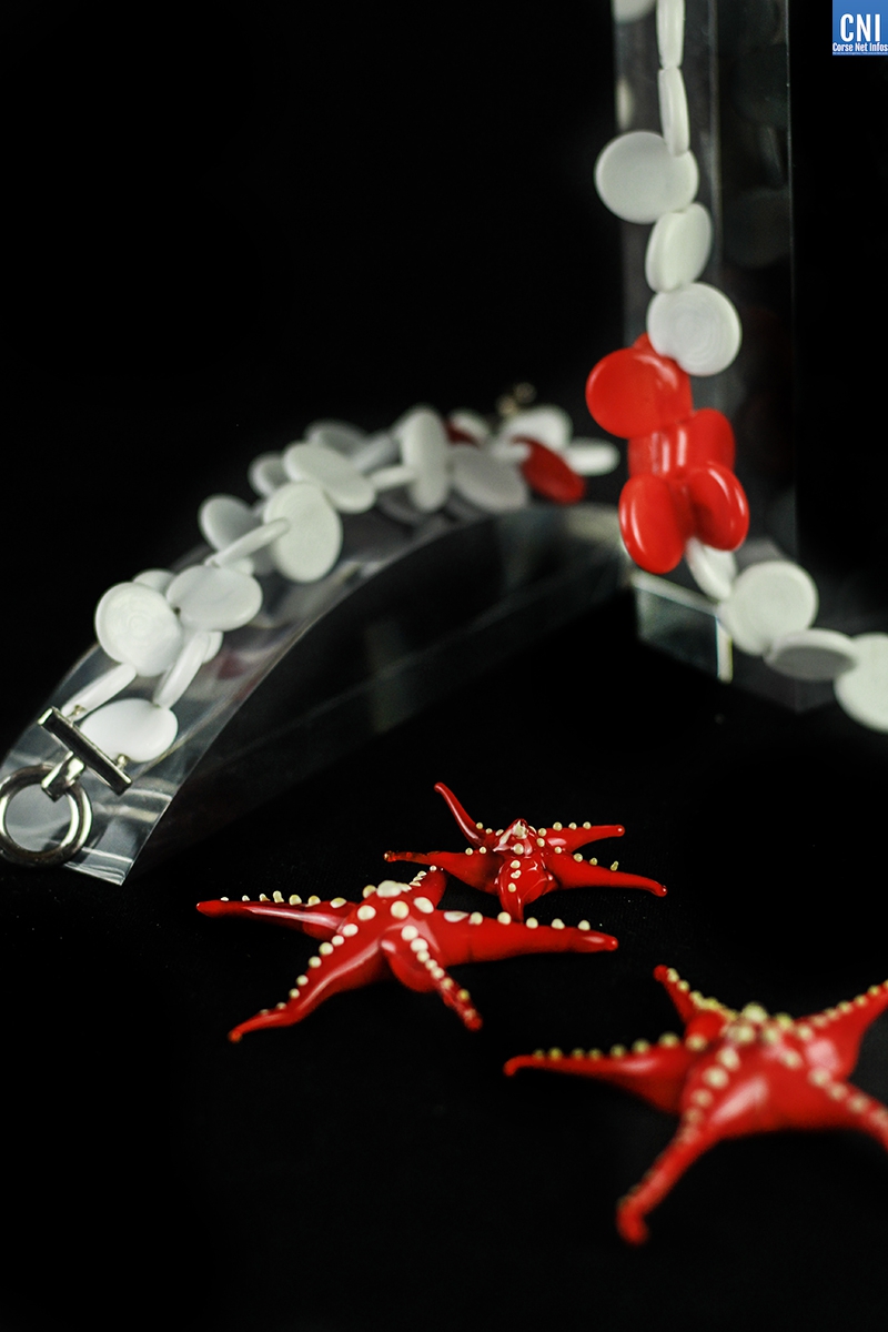 Marie-Christine Marovelli, travaille quant à elle le verre et réalise des bijoux de verre soufflé depuis 2012. Une passion qu’elle a contractée jeune à Strasbourg et qu’elle a repris tout naturellement lors de sa reconversion, après avoir suivi des formations auprès de verriers internationaux de renom : Claudia Trimbur Pagel- MOF, Michi Suzuki, Astride Riedel, Yulia Dyubenko, Alexandra Ilan, Tatiana Boyarinova…. Notre artiste réalise ainsi bracelets, colliers et boucles aux formes et teintes variées, y exprimant sa fascination pour les jeux de lumières, de reflets, de couleurs et de matières que révèle le verre dans son éclat. On découvrira des parures précieuses en verre soufflé ou filé à la flamme, agrémentées d’incrustations d’or, d’argent ou de murines.