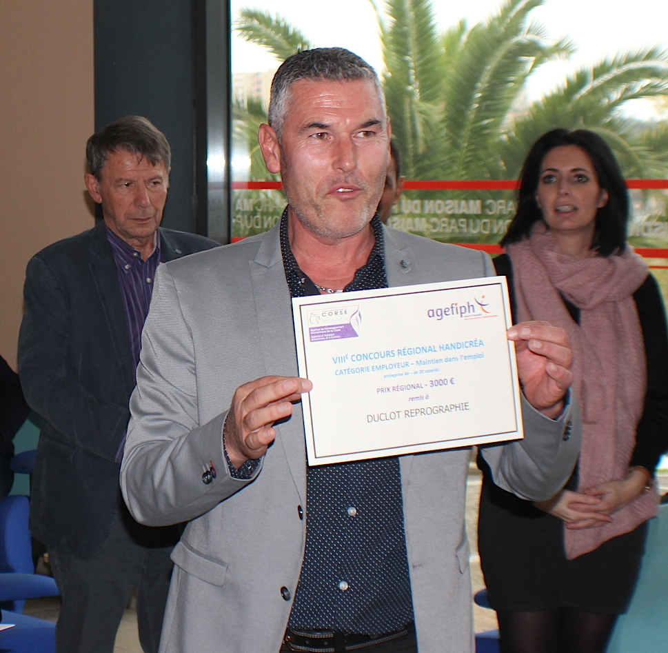 Le prix pour les entreprises qui ont œuvré au maintien dans l'emploi des personnes handicapées a récompensé pour les moins de 20 salariés la société Duclot reprographie de Biguglia, représentée pat Daniel Duclot). Enfin le prix pour l'entreprise de 20 salariés et plus, c'est Sud Corse Hotellerie (Hôtel Restaurant Moby Dick de Porto-Vecchio) qui a reçu le trophée Handicréa.