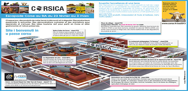 La Corse est présente depuis ce samedi 23 février 2013 au Salon International de l’Agriculture avec un village insulaire de 500m2 reconstitué pour l’occasion, sous l’égide de la Collectivité Territoriale de Corse (Hall 7-2, allée P, Stand 70)
