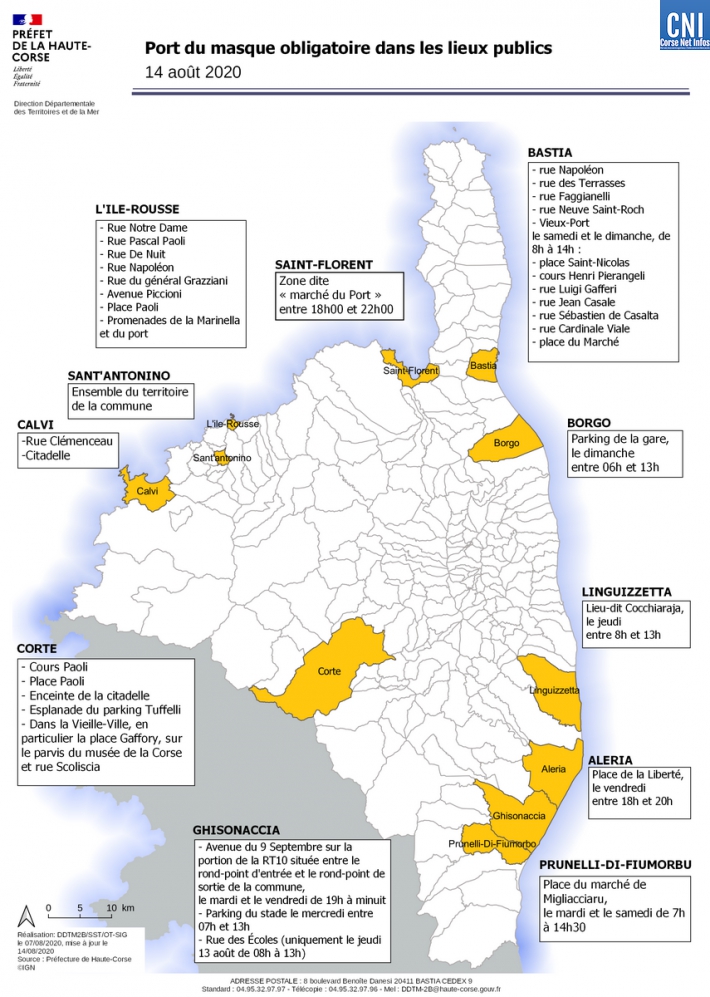 En raison du contexte sanitaire et de la circulation de la Covid-19, le préfet de la Haute-Corse a été amené à prendre, par arrêtés préfectoraux et en concertation avec les élus locaux, des mesures rendant le port du masque obligatoire dans les zones à forte affluence de population de plusieurs communes du département.