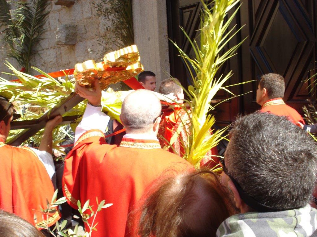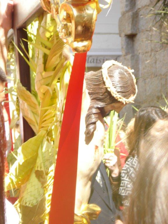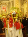 C'est là que la bénédiction des Rameaux, agités par la foule, s'est déroulée puis la procession regagna l'église Saint Jean-Baptiste. Avant d’entrée dans l'édifice pour une fervente messe chantée où les enfants étaient nombreux devant l'autel, le prêtre entouré des confrères a frappé rituellement à trois reprise avec la grande Croix sur la porte de l'église avant qu'elle ne s'ouvre. Une belle cérémonie qui annonce la semaine Sainte et qui s’achèvera le Lundi de Pâques.