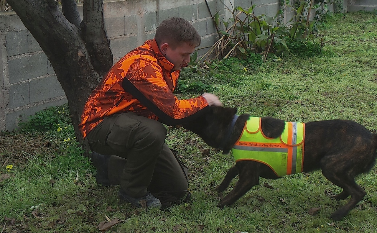 Ils s'appellent Vinja, Emily et Enduro. Ce sont deux chiens Labrador, qui obéissent aux ordres de Nina, une jeune allemande, et un berger hollandais sur lequel Joël, un Sussie, veille tout particulièrement. Les deux premiers décèlent le passage du capricorne asiatique dans un arbre. Le troisième, lui, le localise en aboyant. Au terme de l'inspection, fructueuse, d'une aire suspecte ils ont droit, pour les deux premiers à leur friandise préférée, et pour le troisième au jouet qu'il affectionne tout particulièrement, une balle de tennis en l'occurrence.