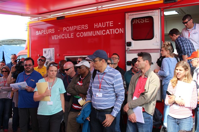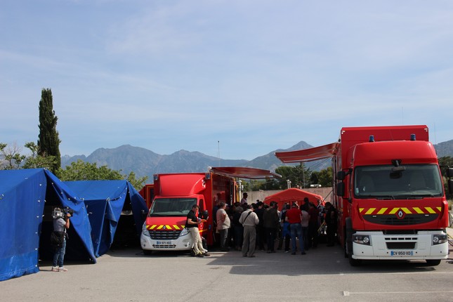 L'alerte est aussitôt donnée. Au PC opérationnel de Calvi mais également au Centre de gestion de crise à Bastia et à Paris où la salle de crise du HCFDC assure l'animation haute de l'exercice et la pression médiatique simulée en continu: flashs TV en direct, avec 3 JRI, en Corse, qui réalisent des reportages et des interviews en direct de Bastia et Calvi...