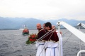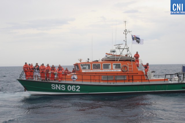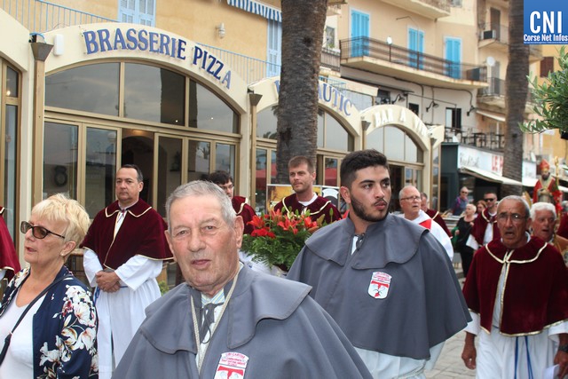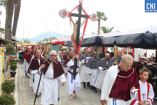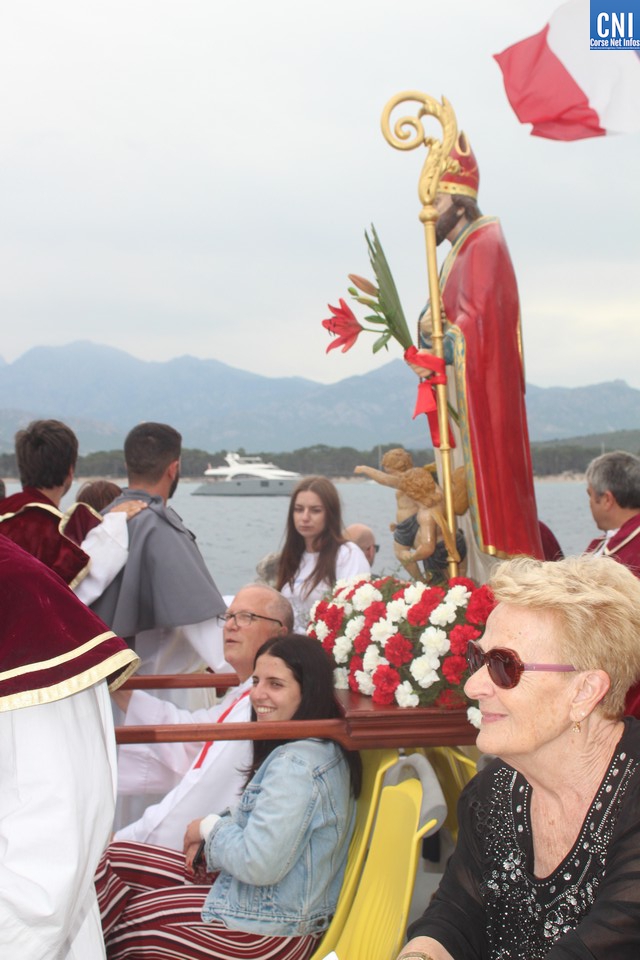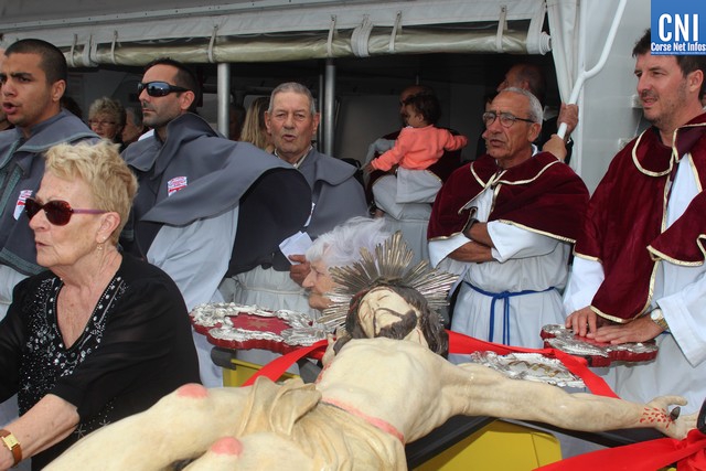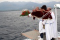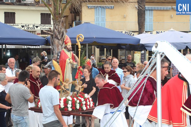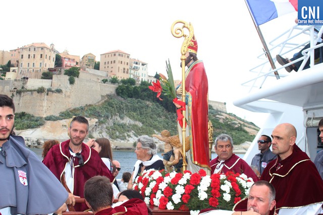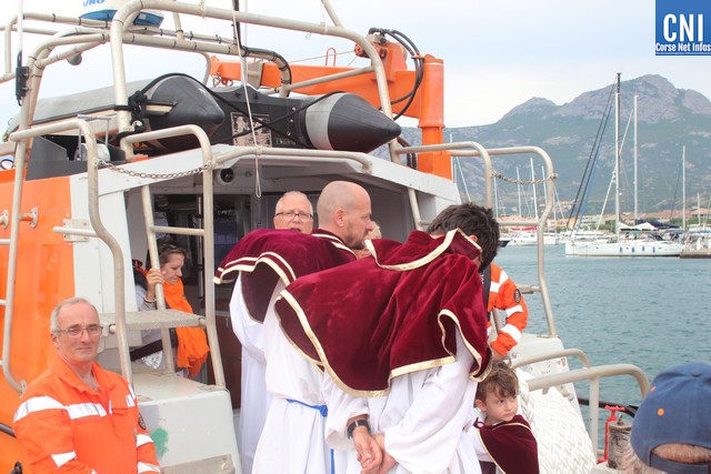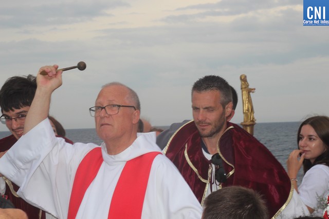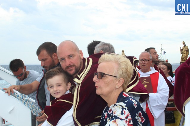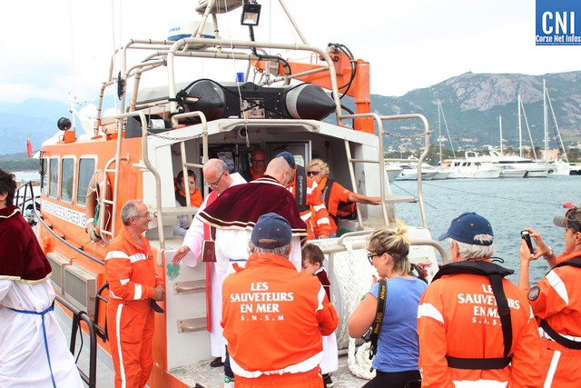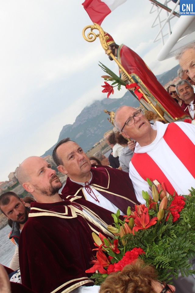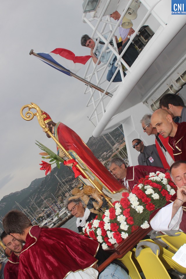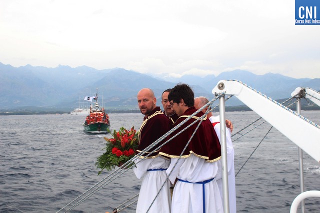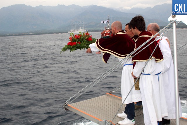 Une foule très nombreuse embarquait ensuite avec le Saint, la Croix du Christ et les confrères à bord de la Colombo Line. Au milieu de la baie de Calvi, une gerbe était lancée en mer, à la mémoire de tous les disparus avant que l'Abbé Valery bénisse le Saint et invite les pèlerins à prier et chanter.
