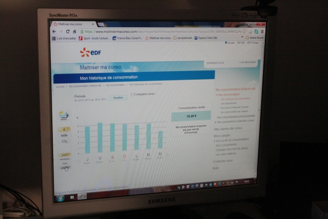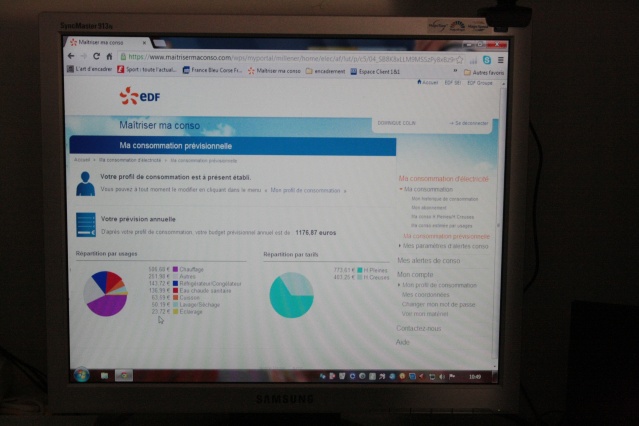 Sur l’écran de son ordinateur, la famille Colin peut avoir accès par exemple, à sa consommation annuelle prévisionnelle qui est, actuellement, de 1177€. Le chauffage, malgré un matériel performant y est impliqué pour plus de la moitié, puis par ordre d’importance de consommation : 2 réfrigérateurs congélateurs, l’eau chaude et les sanitaires, les appareils de cuisson, la machine à laver et le sèche linge, et enfin l’éclairage.