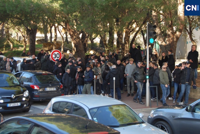 Un peu avant 14 heures, Guillaume, frère aîné de Raphaël, prend la parole et sonne la charge : « Direction le stade », lance-t-il à la foule après avoir décliné son identité. Une fois rassemblés, c'est à nouveau lui qui s'exprime, mais, cette fois, micro en main : « Merci pour la sono, je n'avais rien prévu, c'est l'association Palatinu qui a pensé à tout. » Il commence par remercier toutes ces personnes qui ont fait le déplacement « tous ceux qui nous soutiennent, tous ceux qui sont là de matière amicale. La famille aussi. » Il poursuit : « Je suis ici parce que je représente ma famille, celle de Raphaël, mon frère, choqué de ce qui lui est arrivé. Il a dû rester à la maison, entouré de mes parents qui sont effondrés. Au-delà des blessures physiques, mon frère, qui est étudiant au lycée n'a toujours pas repris les cours. Il est, lui aussi, effondré de ce qui est arrivé. C'est un jeune normal, introverti. » Guillaume est visiblement ému : « Nous ne sommes pas à l'origine de ce rassemblement. Ça nous touche encore plus. On a pu lire tout et n'importe quoi sur les réseaux sociaux et dans certains médias qui se reconnaîtront. Ils n'ont pas pris la peine de se renseigner sur les faits et sur le profil des individus concernés par cette affaire. Pas tous. » Le jeune homme insiste ensuite : « Nous ne sommes engagés dans aucun milieu politique. Nous œuvrons dans les domaines sportifs, sociaux ou artistiques sans distinction ethnique, religieuse et politique. Nous sommes néanmoins très sensibles à tous les responsables politiques qui ont pris la peine de nous appeler et qui sont aujourd'hui à nos côtés. » Ce dernier regrette pourtant les commentaires qui ont fleuri à l'annonce de ce rassemblement « populaire et spontané ». « Il a été qualifié de fasciste et d'autres noms d'oiseaux », se désole Guillaume. « J'espère de tout cœur que ces gens-là n'auront jamais à subir ce que mon petit frère a subi. » Il revient ensuite sur la chronologie des faits. L'histoire commence dans un cinéma au printemps dernier. Les fameux individus, aujourd'hui placés sous contrôle judiciaire (lire ici), font interrompre une séance à force de cris et de jets de pop-corn. « Un manque de respect évident. Mon frère leur a demandé d'arrêter. Six mois plus tard, les mêmes le retrouvent et l'agressent dans un fast-food de Montesoro. Il a réussi à s'échapper. Dans la nuit de vendredi à samedi, ils ont retrouvé mon frère pour en découdre à nouveau. Ils étaient nombreux, il n'a pas pu s'enfuir cette fois. Je le répète, pour certains journalistes : ce n'était pas une rixe ni un rendez-vous programmé ! » s'emporte Guillaume. Le public gronde : « C'est un guet-apens, oui ! » Le frère aîné reprend : « Nous ne stigmatisons pas les habitants du quartier qui subissent également la pression de ces individus. Nous appelons au calme. Toute incitation à la haine nous serait très défavorable pour la suite des événements. » La phrase est prononcée deux fois comme pour mieux insister sur ce point. Il rappelle alors la date de l'audience publique, le 12 février : « Ce jour-là, nous comptons aussi sur votre soutien. Pour que ça n'arrive plus à personne. Il faut que ça s'arrête. On ne se sent plus en sécurité chez nous, dans notre ville. À Bastia ou à Furiani. » Longuement applaudi, le jeune homme finit par laisser la place à Nicolas Battini de l'association Palatinu.