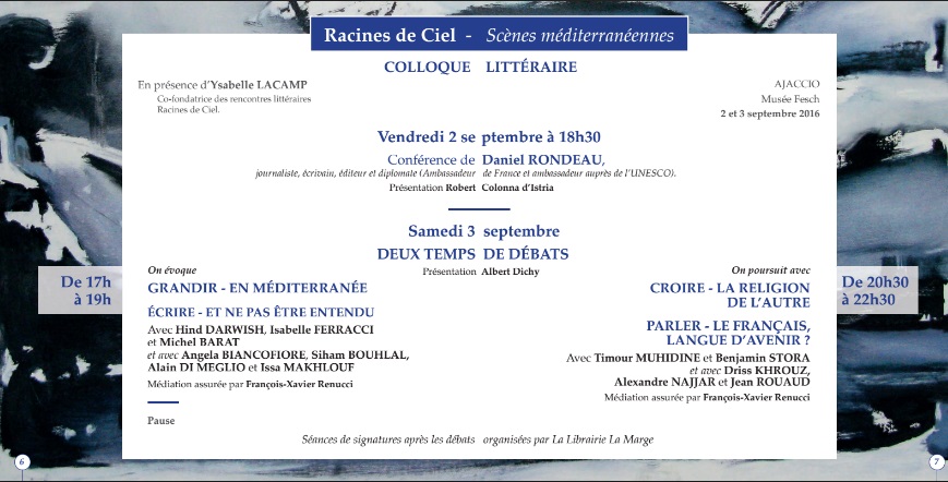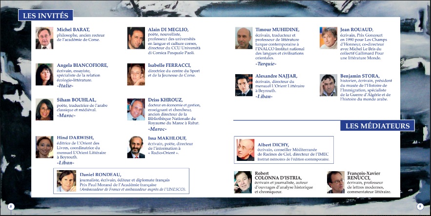 Autour du livre et au nom de l'ouverture, cinq pays se rejoindront en Corse, l'île-capitale en Méditerranée : France, Italie, Liban, Maroc et Turquie. 12 personnalités-références interrogeront différentes thématiques : Grandir en Méditerranée, Ecrire et ne pas être entendu, Croire la religion de l'autre, Parler le français, langue d’avenir ?