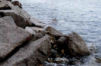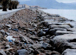 Face à la caserne, sur 30 à 40 mètres, la digue est désorganisée avec disparition des éléments de petite taille et instabilité des éléments les plus gros,
