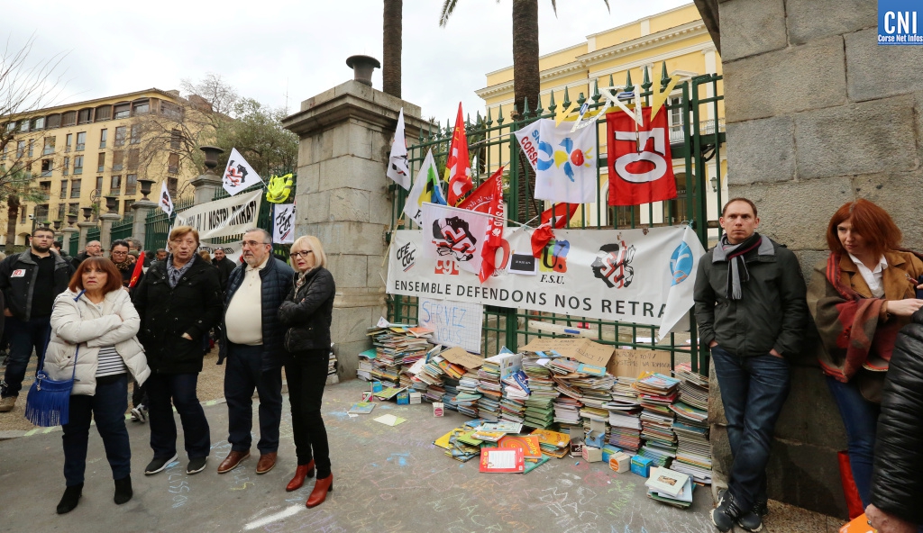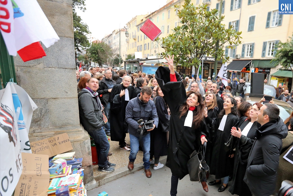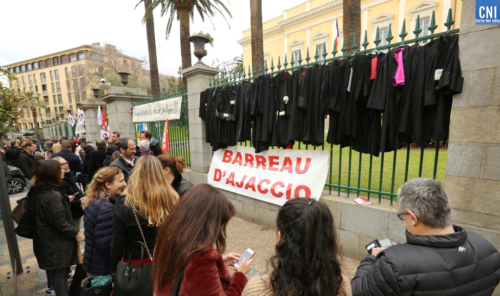 En Corse ce 24 janvier, au cours de la troisième semaine de protestations, les avocats ont accroché leurs robes noires à la grille de la préfecture d'Ajaccio avant de jeter des copies du code civil dans l'enceinte de cette antenne de l'Etat.