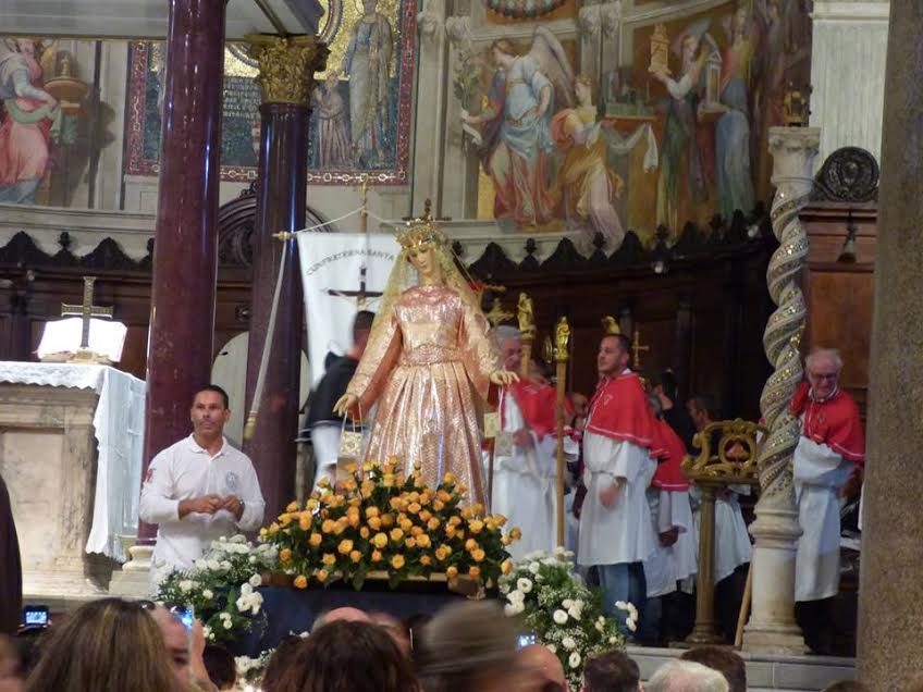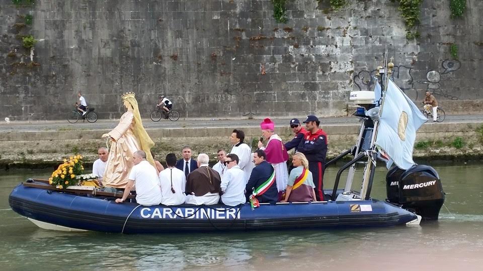 Cette messe fut suivie le dimanche 26 de la procession de la Madonna Fiumarola. Sur une barque, entourée de fleurs, la Vierge Marie a remonté le Tevere (Tibre). Les confréries corses et celle de l’Archiconfraternita del Santissimi Sacramento e Maria Santissima del Carmine in Trastevere attendent sur la berge du fleuve noire de monde. La procession suivie par une immense foule, dont plusieurs centaines de fidèles corses (on notera la présence de Pierre Ghionga de la Collectivité Territoriale de Corse, conseiller exécutif en charge de la langue corse, et parmi les confrères de l’historien Antoine-Marie Graziani), traverse le Trastevere, l’ancien quartier des Corses, et passe sur la place où se situent San Crisogono et Santa Agata, siège de la confrérie.